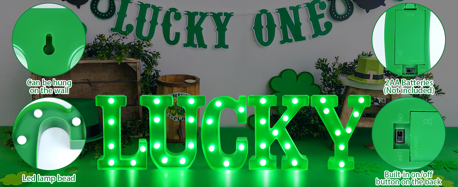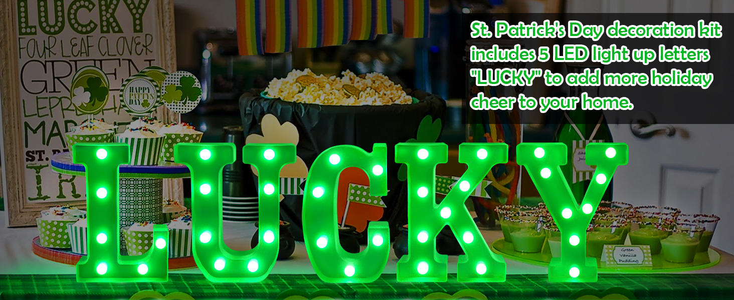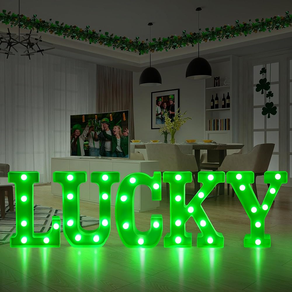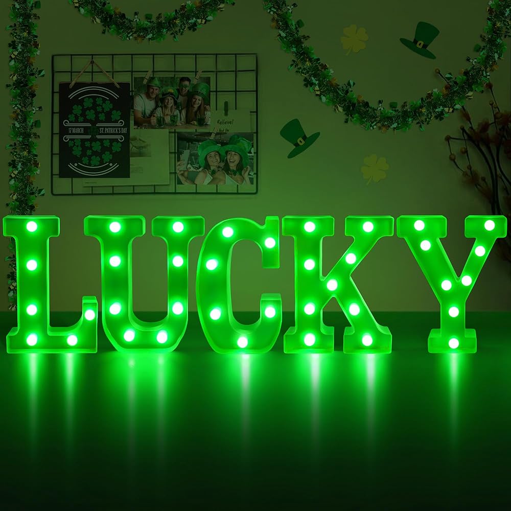 ديكور يوم القديس باتريك - هذه اللافتات المضيئة "LUCKY" مناسبة لحفلات المنزل في يوم القديس باتريك في الداخل/الخارج، وغرفة المعيشة، وغرفة النوم، والطاولة، والمدفأة، والرف، وأي مكان آخر.