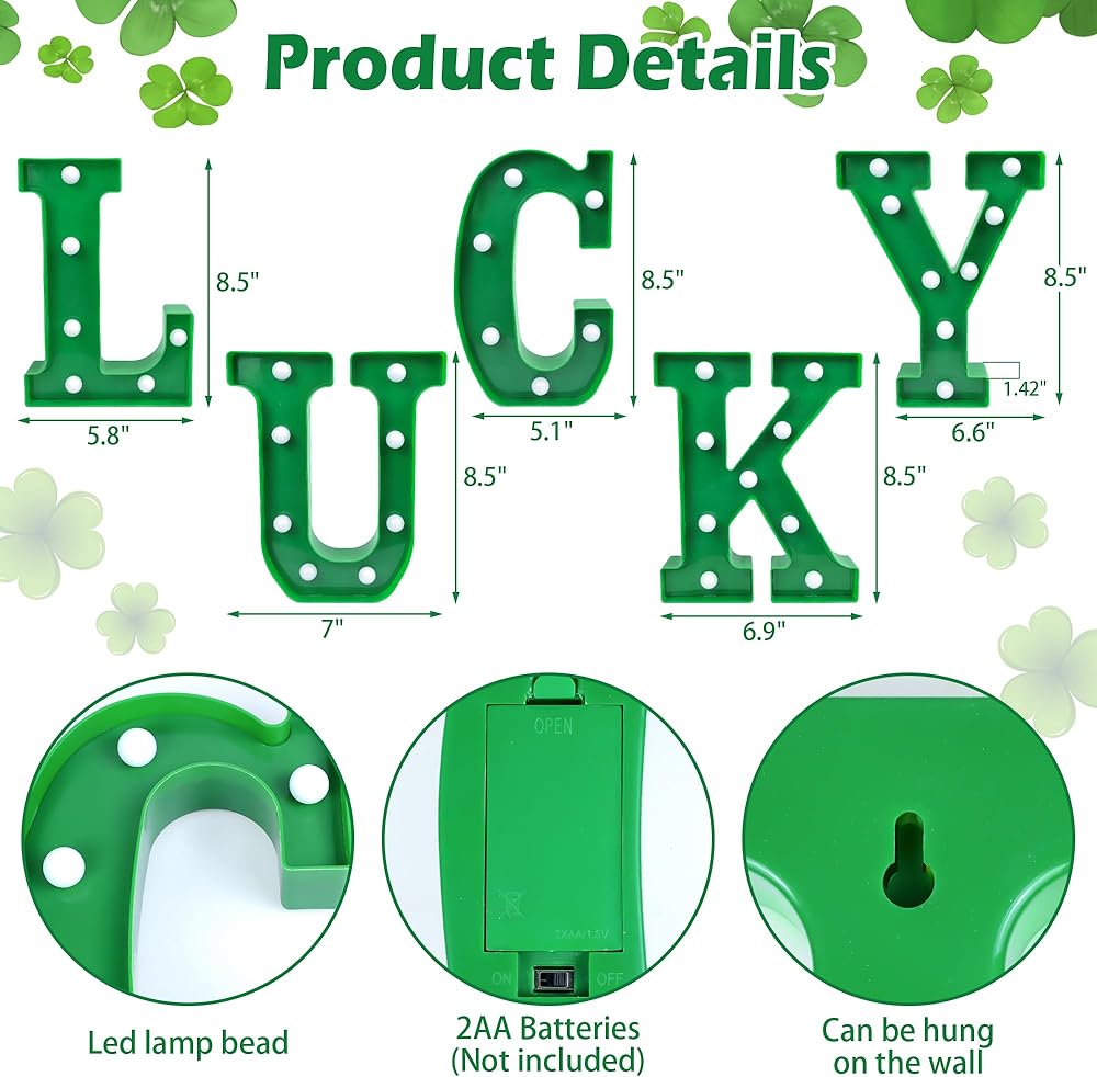 الحجم والمواد - الحروف المضيئة "LUCKY" مصنوعة من البلاستيك ويبلغ مقاسها تقريبًا. "L": 8.5"*5.8"، "U":8.5"*7"، "C":8.5"*5.1"، "K":8.6"*6.9"، "Y":8.6"*6.6"، السُمك 1.42 سم. أضئ حفلة عيد القديس باتريك الخاصة بك.