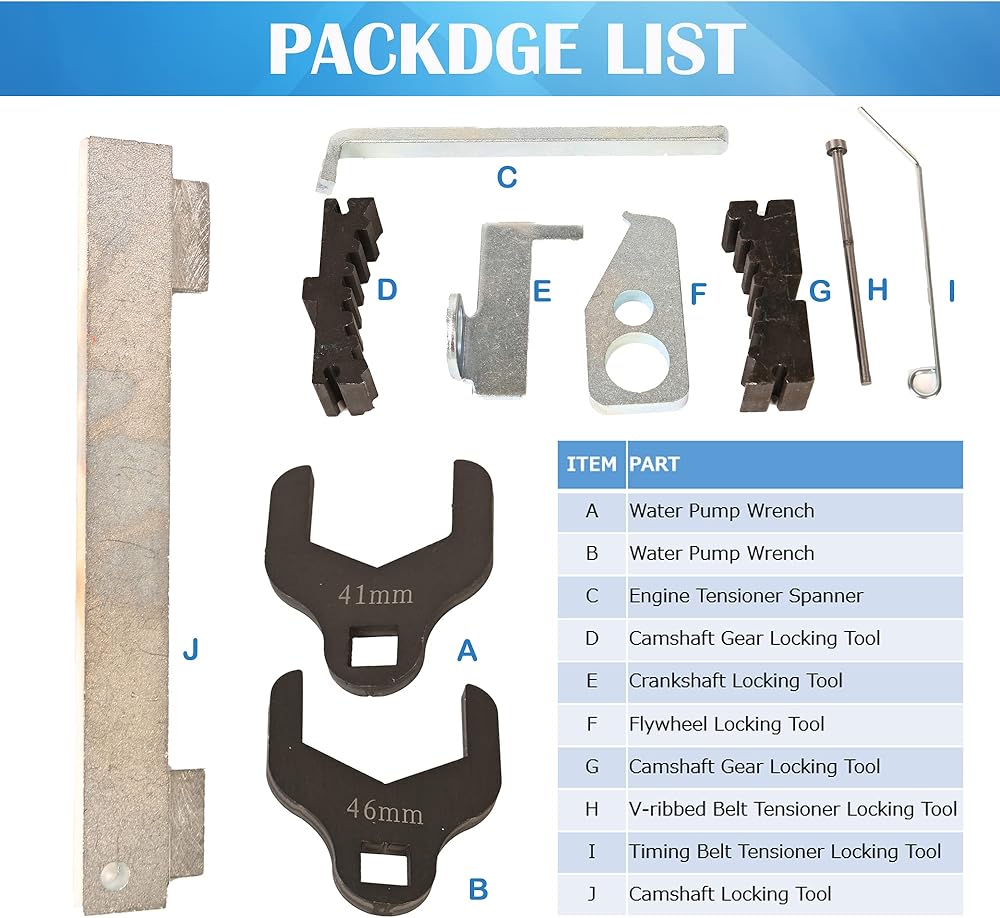 • خدمة ممتازة - تأتي مع حقيبة محمولة، تتضمن قطعتين من مفتاح مضخة المياه، قطعة واحدة من أداة قفل عمود الكامات، قطعتين من أداة قفل تروس عمود الكامات، قطعة واحدة من أداة قفل دولاب الموازنة، قطعة واحدة من أداة قفل العمود المرفقي، قطعة واحدة من مفتاح شد المحرك، قطعة واحدة من أداة قفل شداد الحزام المضلع على شكل حرف V ، قطعة واحدة من أداة قفل شد حزام التوقيت، وزوج من القفازات. مريحة لحمل وتخزين جميع الأجزاء. تأتي أداة محاذاة عمود الكامات هذه مع ضمان لمدة 12 شهرًا. إذا كانت لديك أي أسئلة حول جودة المنتجات، فلا تتردد في الاتصال بنا عبر رسائل أمازون مباشرة.