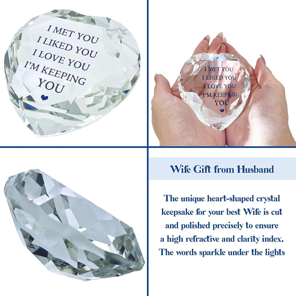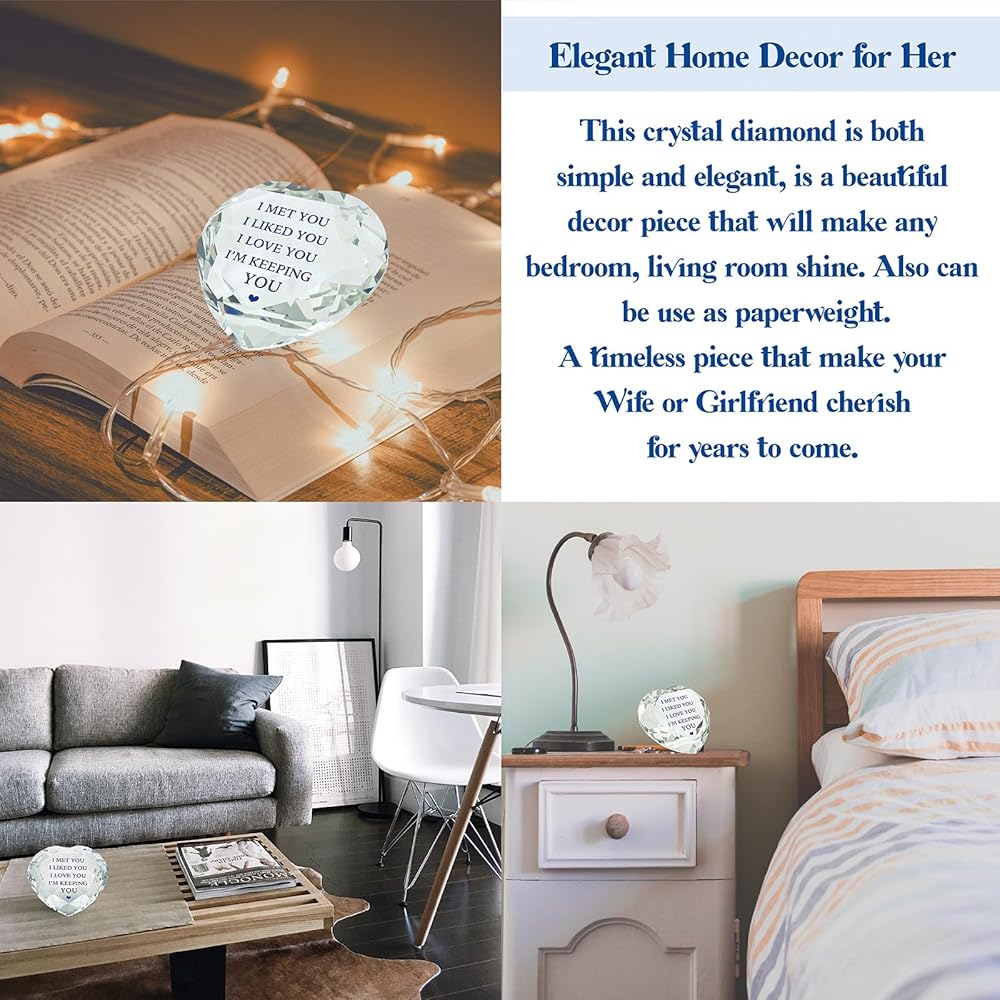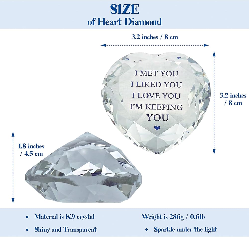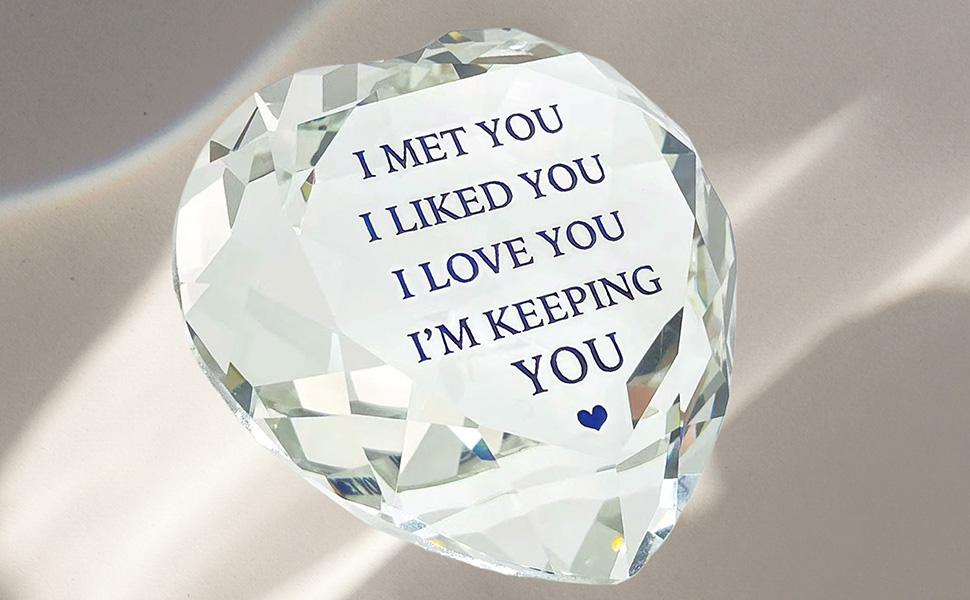 • أنا أحبك ألماس كريستالي على شكل قلب مع تصميم جميل ورسالة حب "لقد التقيت بك، أحببتك، أحبك، أنا أحتفظ بك" لتذكير من تحب بمدى حبك لها، وجعلها تشعر بالتميز والحب مع هذا القلب الصادق هدية