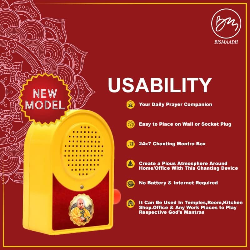 BISMADDH All religious Mantra Machine Speaker Box - In this You listen Various Types of Vedic mantras in all religious pure digital musical form and feel an immediate soothing effect that brings eternal bliss, peace, calm and tranquility in your mind., These are the same mantras from rig vedas that have helped to attain complete peace of mind and nirvana for thousands of years. There's no reason why it can't do the same for you. All Mantras Repeat.Our chanting boxes are the best in class with premium and divine voice quality fits perfectly at your home, office or work station. Create a Devotional Atmosphere by our wide range of mantra chanting boxes. Perfectly works as a gift for all occasions like Housewarming/Grah Pravesh, Inaugral Ceremonies, Birthday,Anniversary and various other occasions