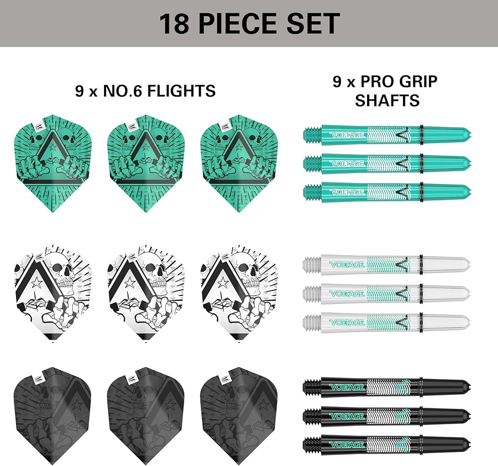 Target Darts, in collaboration with the PDC Champion, Rob “Voltage” Cross, presents an outstanding shaft and flight combination pack, featuring a captivating hand-drawn tattoo design to enhance your game. This comprehensive bundle includes three sets, each comprising 9 flights and 9 matching shafts, available in three vibrant colours to suit your game. The Pro Grip Shafts, continuing the eye-catching tattoo theme from the flights, come in Short (31mm), Intermediate (41mm), and Medium (48mm) lengths, equipped with a Pro Grip ring for enhanced flight grip. Additionally, they feature a universal 2BA thread for compatibility with most barrel brands. The striking tattoo design is expertly applied to durable 100-micron No.6 flights, ensuring a universal fit with all market shafts. This pack contains 9 Pro Grip Shafts and 9 No.6 Flights, combining style and performance in a fantastic value bundle, making it the perfect choice to elevate your darts experience