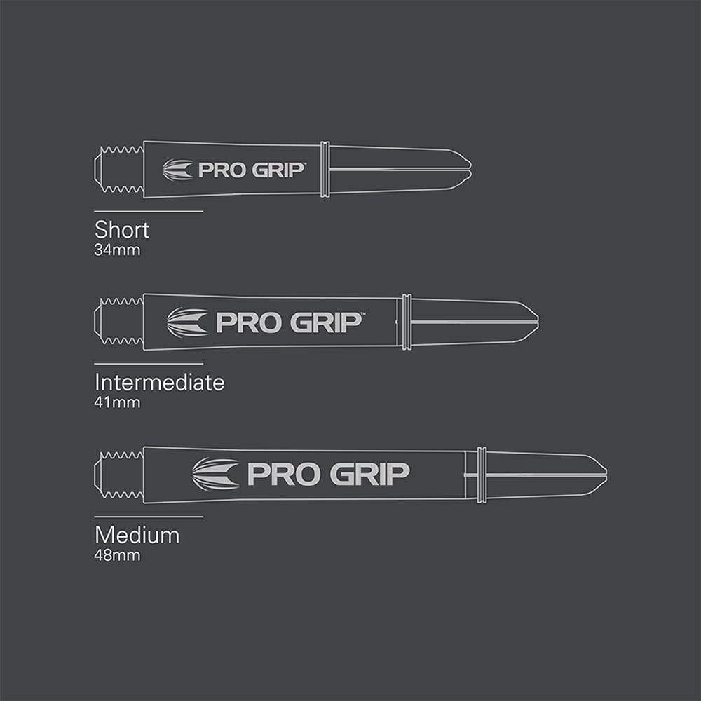 Pro Grip Shafts – The quality Pro Grip shafts, which carry on the eye-catching tattoo theme from the flights, feature a Pro Grip ring for added flight grip and come in Short (31mm), Intermediate (41mm) and Medium (48mm) lengths. All Target Darts shafts have the universal 2BA thread, ensuring maximum compatibility with most barrels from virtually any brand.
