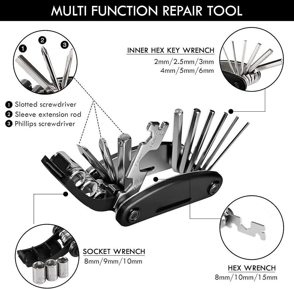 مجموعة أدوات الدراجة الوظيفية: مفتاح ربط المقبس، مفك براغي مشقوق، قضيب تمديد مقبس مفك البراغي من فيليبس، مفتاح ربط صلب، مفتاح ربط سداسي. باستخدام أداة الدراجة متعددة الوظائف 16 في 1، يمكنك إصلاح معظم مشكلات الدراجة بسهولة.