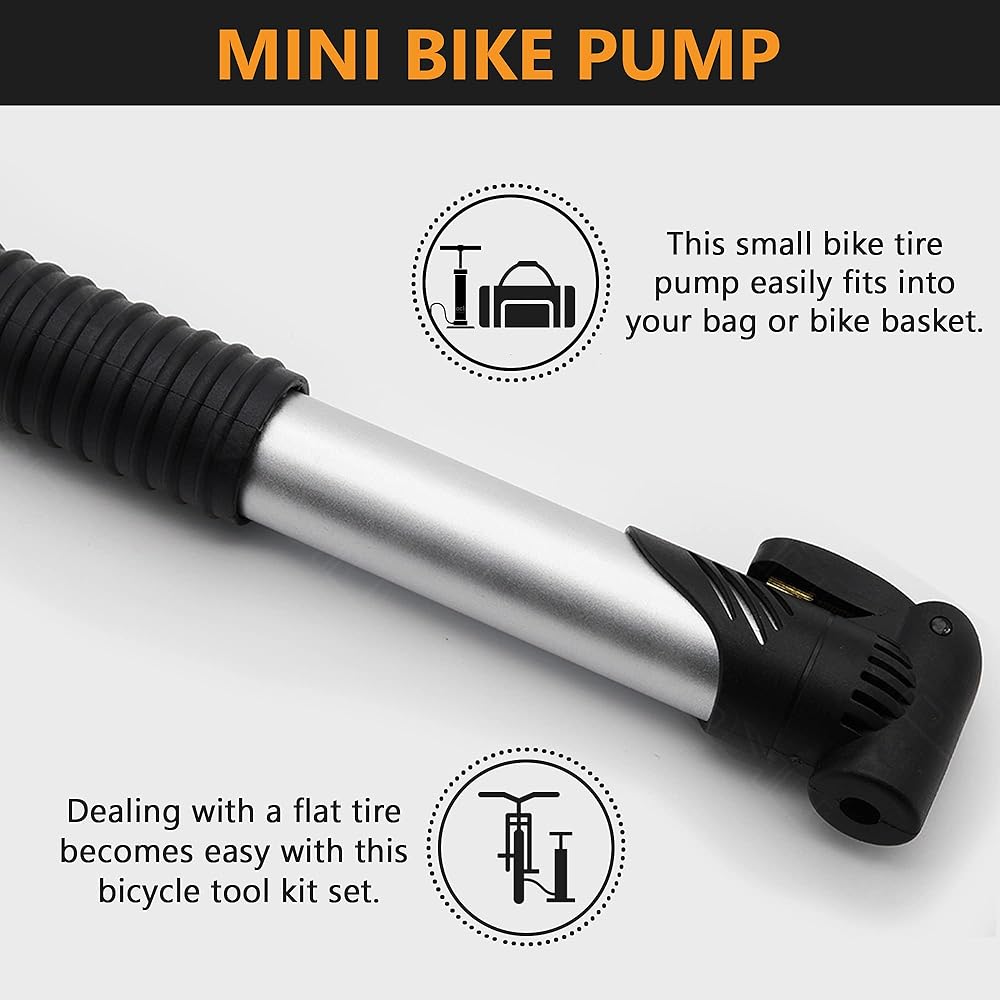 مضخة مدمجة: أثناء الإصلاحات الطارئة، يمكن استخدام مضخة الدراجة اليدوية الصغيرة بسهولة لنفخ إطارات الدراجة وهو سهل الاستخدام للغاية. تتضمن أيضًا دعامة ربط للدراجة، وصمام شريدر، وإبرة كروية، وفوهات هواء، مناسبة لنفخ معظم الأشياء القابلة للنفخ مثل إطارات الدراجة، والكرة الرياضية، وحلقة السباحة والمزيد.