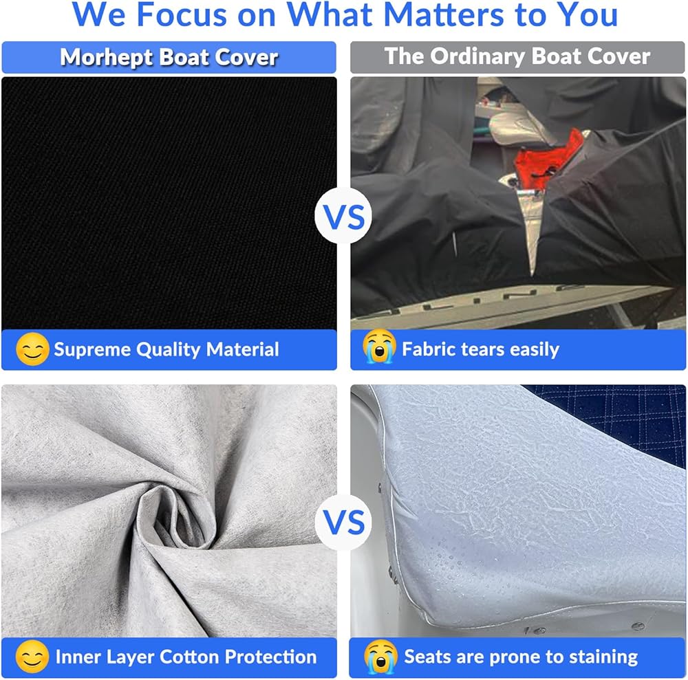 أداء يمكن الاعتماد عليه: تم تصميم غطاء القارب المقاوم للماء من Morhept بدقة باستخدام عملية صباغة مميزة وصبغات عالية الجودة، مما يضمن ثبات الألوان المتميز. وهذا يضمن أن الغطاء لن ينزف صبغًا، مما يحافظ على قاربك خاليًا من البقع والبدن نظيفًا وجافًا بشكل لا تشوبه شائبة. الطبقة الداخلية لغطاء القارب الخاص بنا مدمجة لتوفير حماية إضافية، مما يضمن أنه لن ينقل الألوان إلى وساداتك.