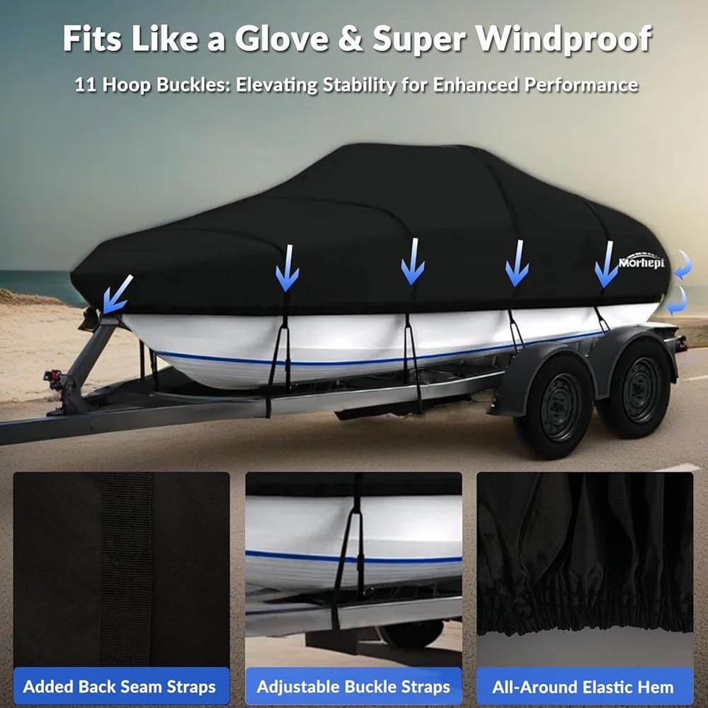 مصمم بعناية للاستخدام العملي: يتميز غطاء القارب الخاص بنا بأشرطة خلفية مخيطة مسبقًا في مكان استراتيجي، مما يضيف تعزيزًا قويًا أثناء النقل. استمتع براحة سهلة الاستخدام مع 12 حزامًا متضمنًا، بما في ذلك حزام احتياطي لمزيد من الضمان. بالإضافة إلى ذلك، استمتع بلمسة مدروسة لمجموعة مجانية مكونة من 11 كيس رمل، مصممة بشكل مثالي لتلبية احتياجات الإرساء الخاصة بك وتوفير الاستقرار في الظروف الجوية المتغيرة.