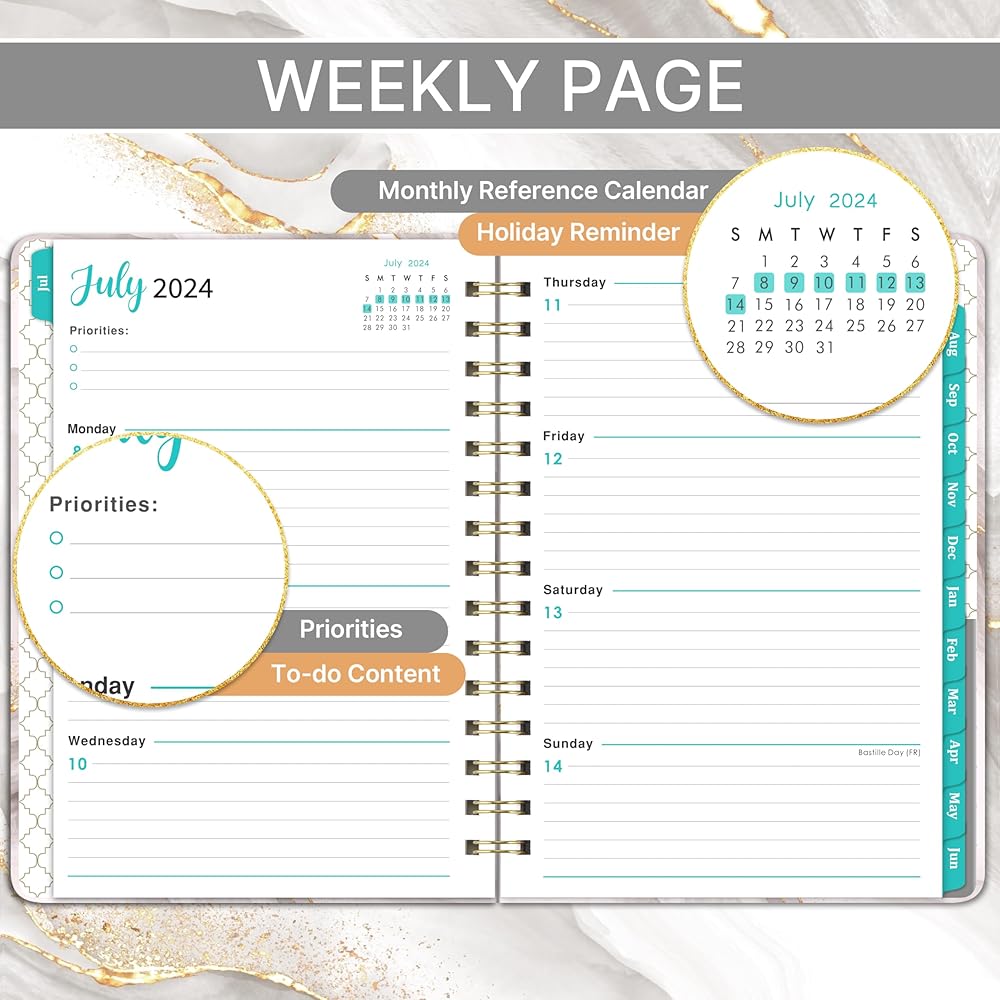 ☕ نظرة عامة أسبوعية - يوفر مخطط 2024-2025 الأسبوعي والشهري مساحة كتابة أفقية متباعدة بمسافة 0.28 بوصة للأولويات، ويمكنك عمل قائمة بالأشياء العاجلة في حالة نسيانها. بدلاً من المخطط اليومي، يمكنك أيضًا الحصول على تذكيرات للعطلات.