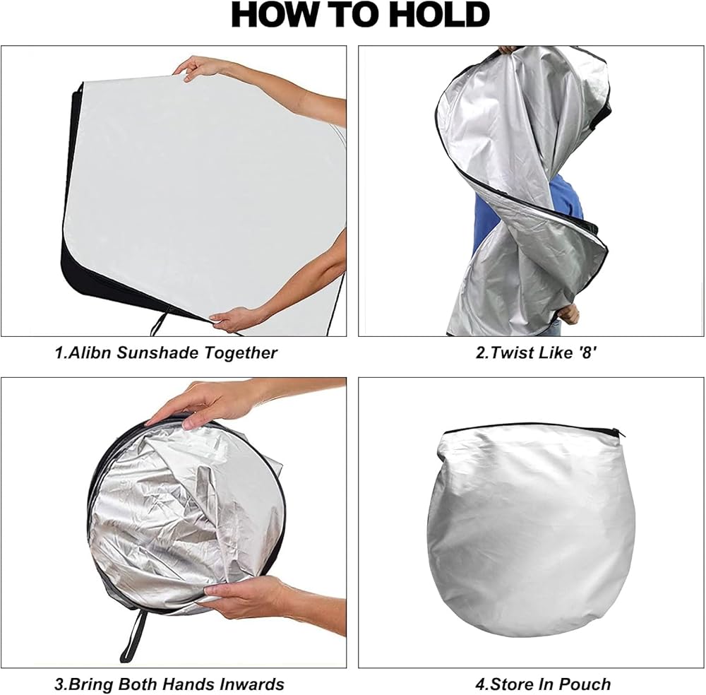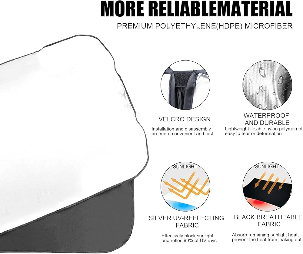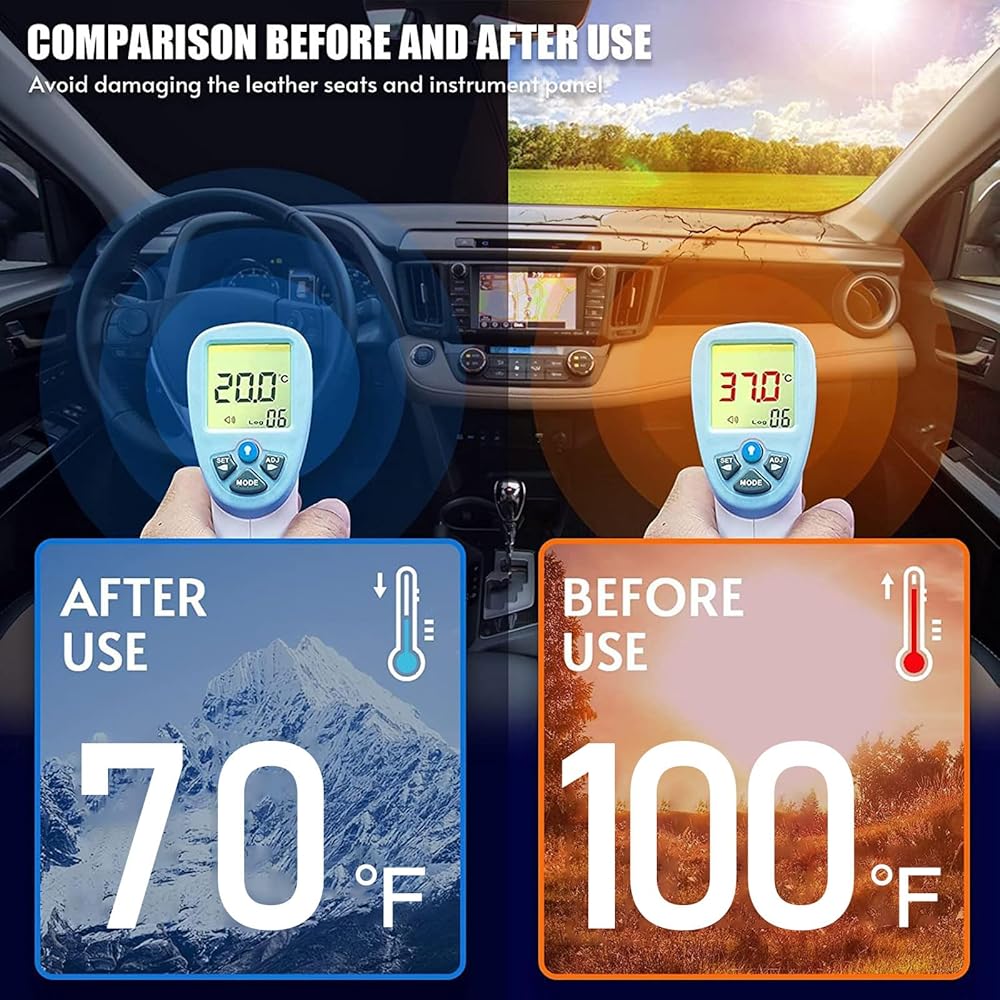 【حماية رائعة】تم تصميمها بطبقة فضية لتعكس الحرارة لتقليل تراكم الحرارة حتى 40 درجة، وسوف تمنع 99% من الأشعة فوق البنفسجية الضارة. حافظ على برودة سيارتك وساعد على حماية المقاعد الجلدية من التشقق والبهتان.