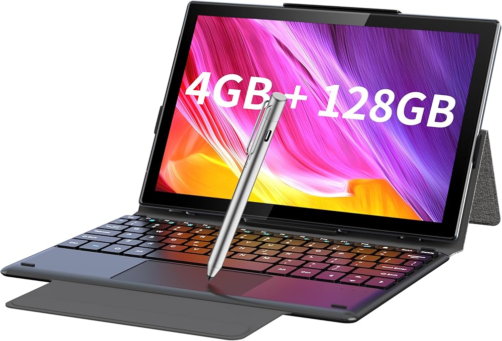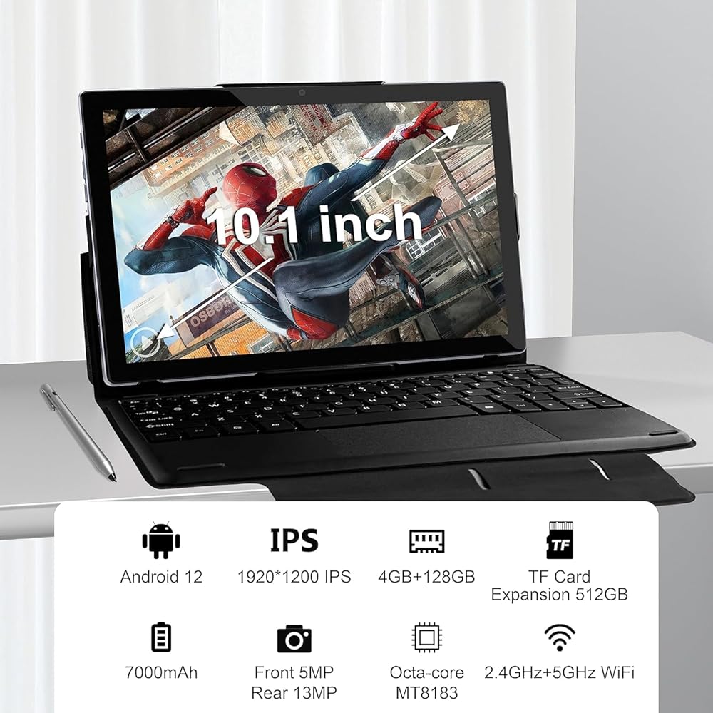 تابلت 10.1 بوصة مع لوحة مفاتيح، 2 في 1 أندرويد 12 تابلت 128 ذاكرة وصول عشوائي 4 جيجابايت، شاشة IPS 1920 × 1200، بطارية 7000 مللي أمبير، معالج ثماني النواة، كاميرا مزدوجة، 2.4 جيجا + 5 جيجا واي فاي، بلوتوث، نظام تحديد المواقع، قلم (جسم معدني)