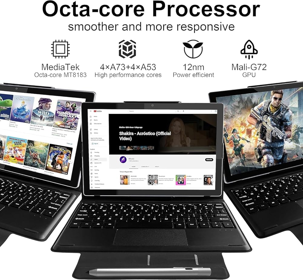 • 【High Performance Processor+Gaming Tablet】Tablets adopt the octa-core CPU "MT8183" developed by MediaTek, manufactured in a low-power 12nm process, combined with the Mali-G72 graphics processor. It is equipped with four high-performance cores of the A73 architecture up to 2.0 GHz to achieve low power consumption and low heat generation, and various enhancements enable nimble operation and faster processing. It's also a great tablet for gaming.