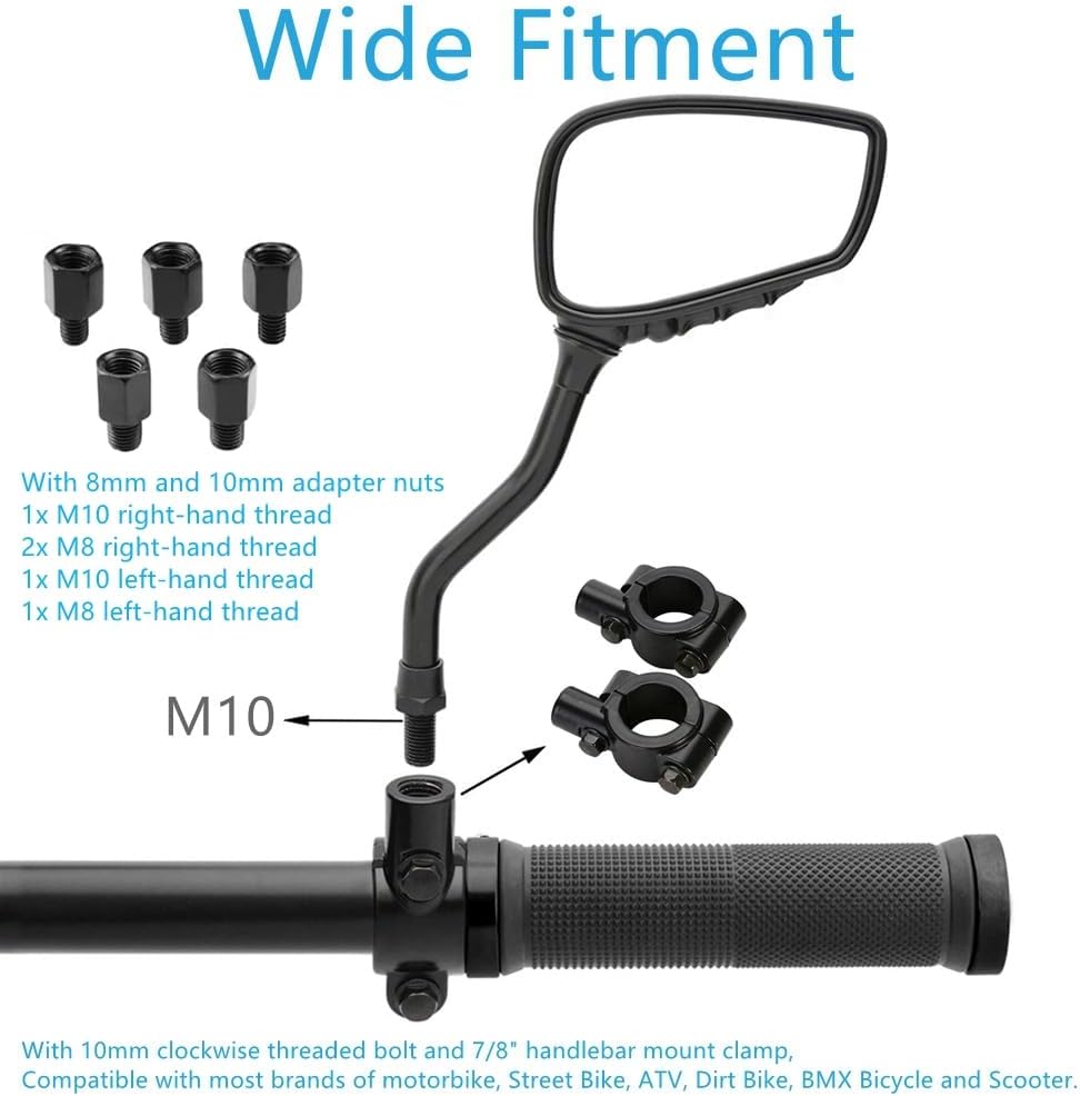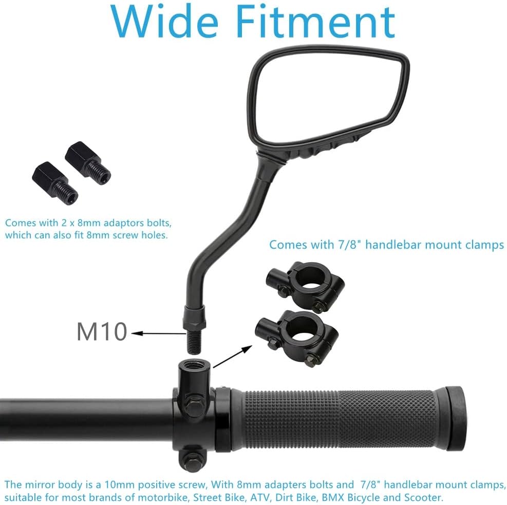 Widely suitable Come With 8mm clockwise threaded bolt and 7/8" handlebar mount clamp, will fit for Motocycle Scooter, Street Bike, ATV, Dirt Bike, BMX Bicycle