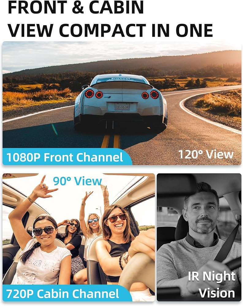 • 【 24H Loop Recording & G-Sensor 】 The Dash camera will automatically loop recording of front and internal footage, and will overwrite the oldest footage with the latest footage after the card is full. The device's G-sensor detects sudden collision, speeding, acceleration and deceleration, sharp turns and other events, and sync the 15sec footage before and after incident to the "event file" in the cloud to prevent the video from being overwritten. Supports up to 256GB TF card.