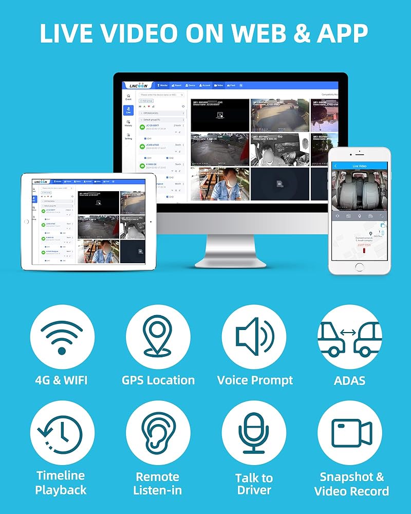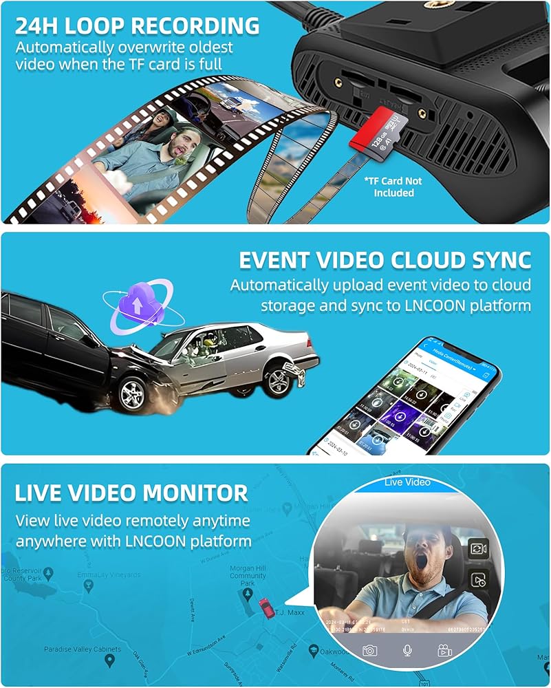 • 【1080P front and 720P inside view】 Dual lens dash cam captures the front and inside videos. The images of the two channels can be remotely monitored via the LNCOON IOT App 24 hours a day. When an incident occurs, both footage from the front and cabin camera can be uploaded to the cloud storage. The inner camera featured night vision. And the tracking webpage supports up to 9 channels which can check multiple devices's live stream at the same time.