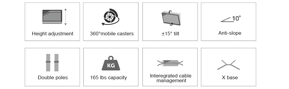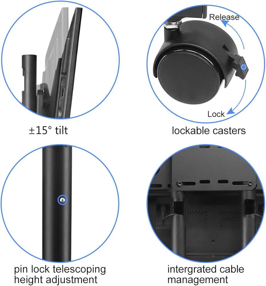 - قابل للتعديل - الارتفاع من 39 بوصة إلى 56 بوصة (عرض المناظر الطبيعية فقط)؛ الميل من +15 درجة إلى -15 درجة