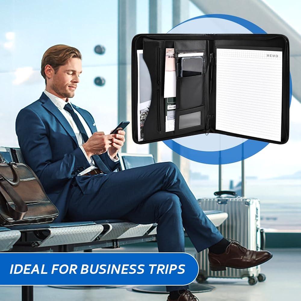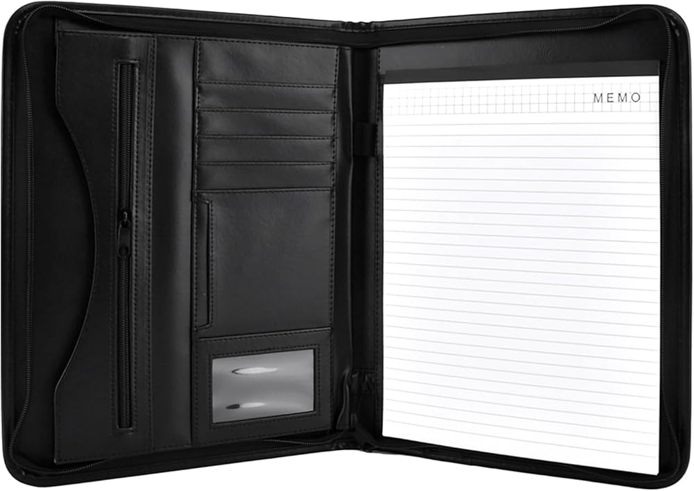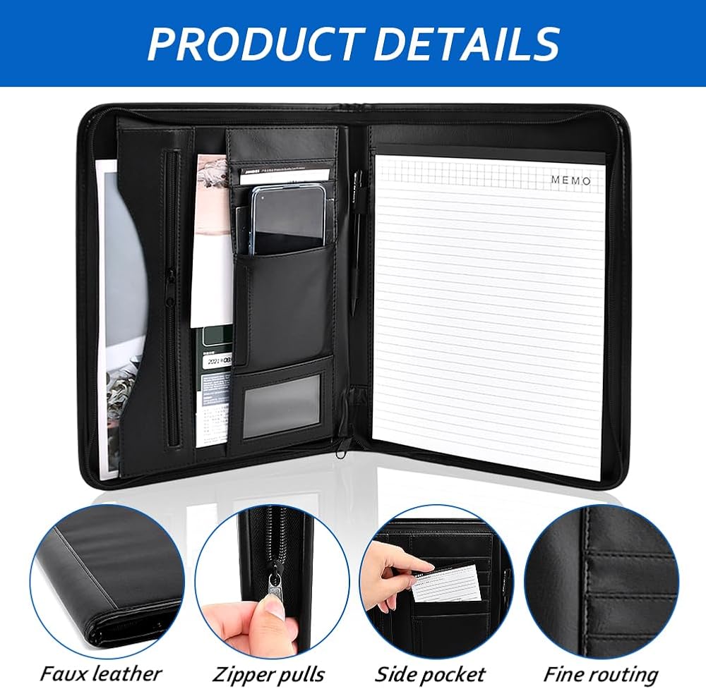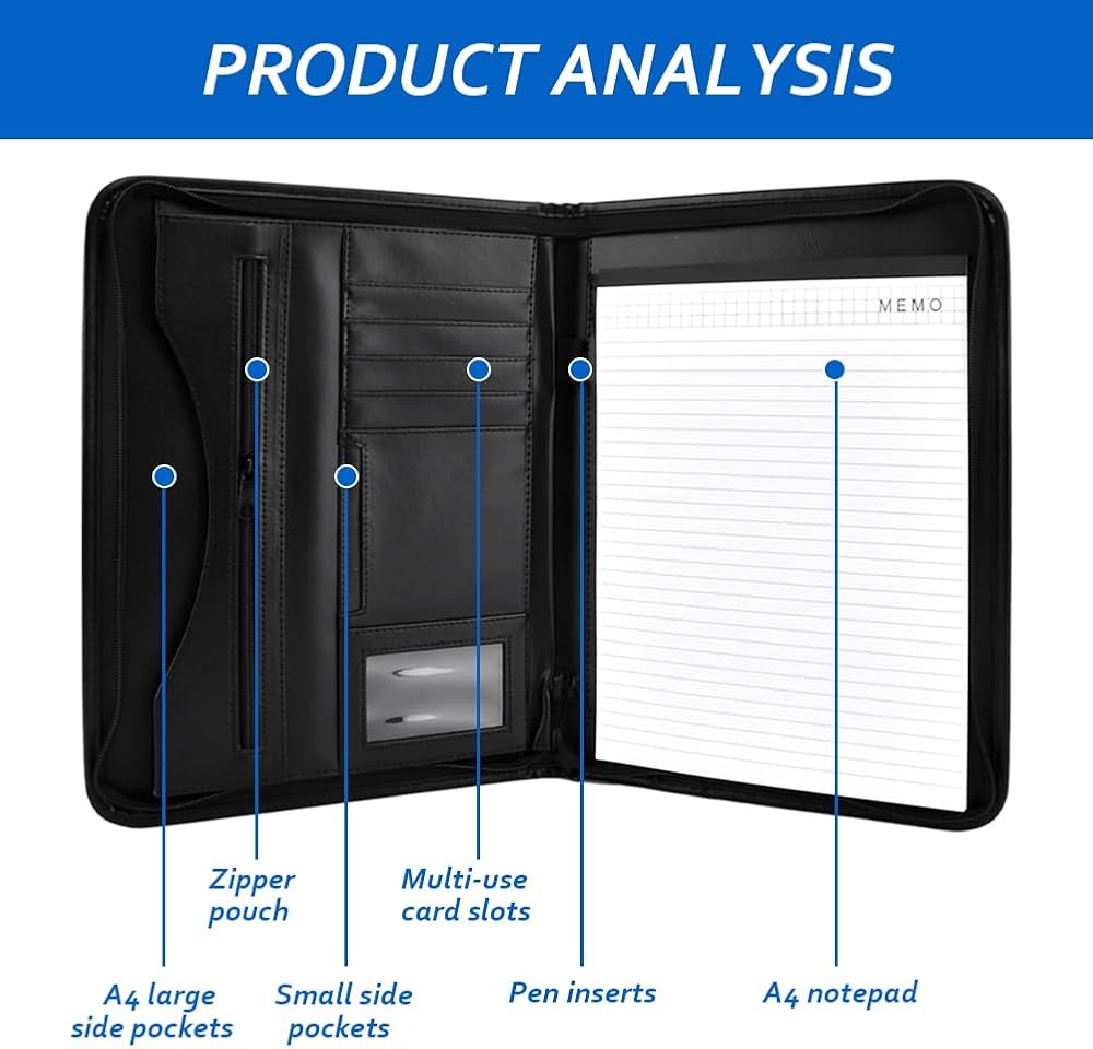 【MAIN STRUCTURE】Zippered portfolio consists of six parts: zipper pocket, multi-purpose card slot, A4 memo pad, A4 large side pocket, small side pocket, pen holder, a helper for office woking
