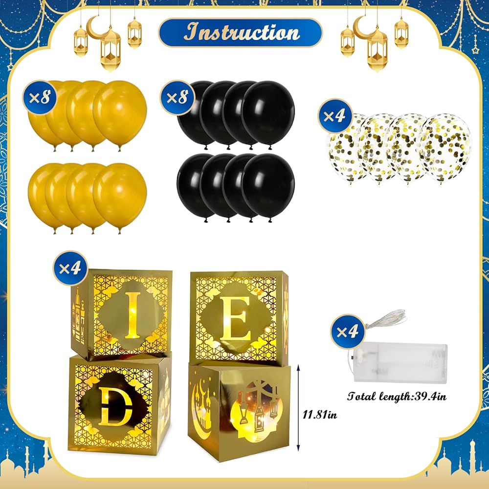 Package Included:4 x Ramadan balloon boxes;20 x Eid Mubarak balloons;4 x Eid Mubarak strings lights