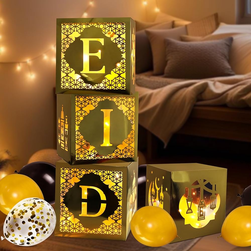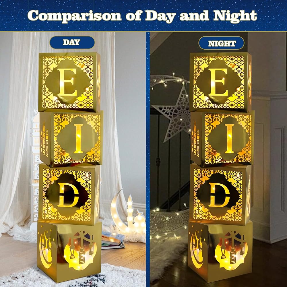 4 قطع من صناديق تزيين عيد مبارك مع أضواء و20 قطعة من بالونات عيد مبارك، صناديق رمضان مبارك مجوفة مع تصميم قمر المسجد لتزيين حفلات رمضان مبارك إسلامي