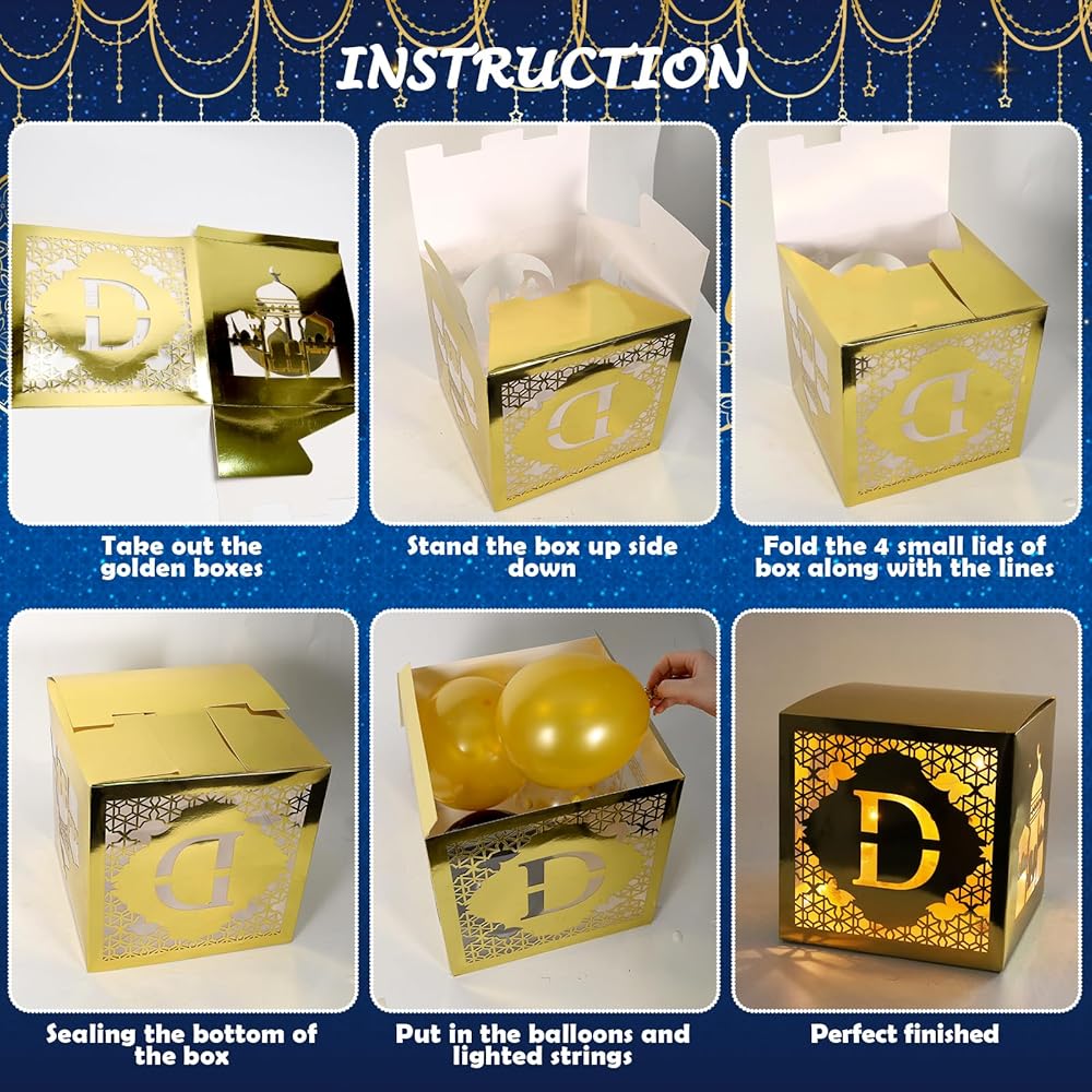 • Easy To Install - These Ramadan Mubarak boxes are easy to install, each box has pre-printed creases for quickly assemble by folding as shown, putting some balloons in the box according to your need and placing them anywhere you want, creating an eye-catching holiday decorations.