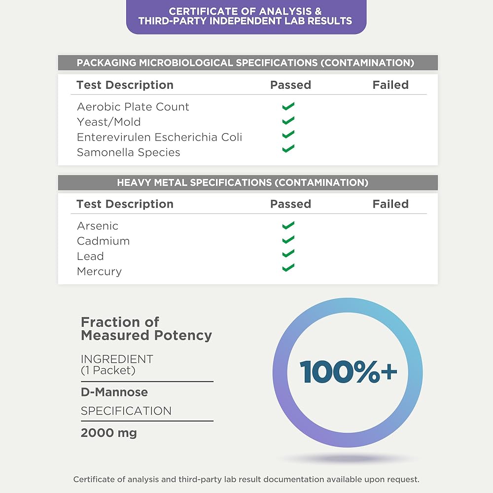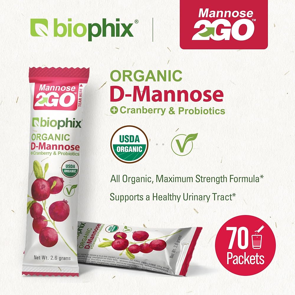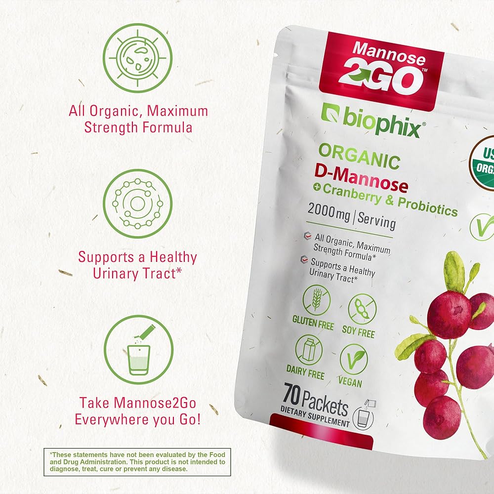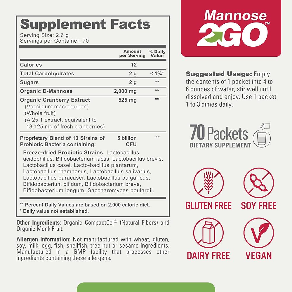 Introducing Mannose2Go packets, your ultimate solution for conveniently taking your daily dose of D-Mannose everywhere you go! Crafted from an organic source of D-Mannose, each convenient packet delivers a full dose of 2000 mg of D-Mannose, fortified with 525 mg of cranberry extract for added support. Harnessing the power of nature, our formula also boasts 5 billion CFU per serving of a potent 13-strain probiotic blend, creating the perfect synergistic effect. We pride ourselves on using only the finest organic ingredients, free from additives and pesticides, ensuring a clean and wholesome product. Manufactured with care in the USA in our own cGMP certified facility, our product is backed by over 25 years of experience and organic certifications, guaranteeing strict quality control measures. Plus, rigorous third-party lab testing ensures purity, potency, and safety, giving you peace of mind with every serving. Gluten-free, soy-free, dairy-free, and suitable for vegans, our formula caters to various dietary preferences and restrictions. Because we believe that everyone deserves access to quality health products, we stand by our commitment to excellence. Trust Mannose2Go for premium quality and unparalleled support for your health journey!