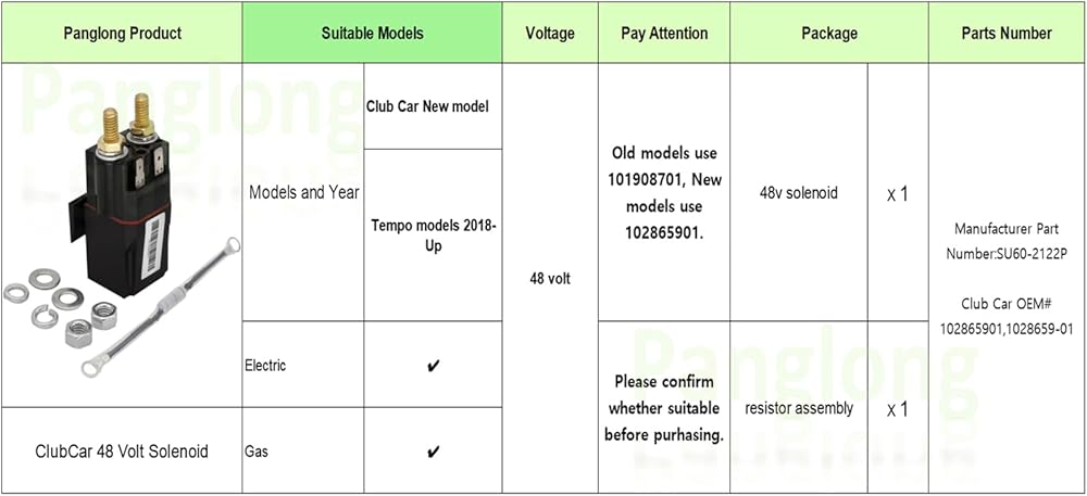 الاستبدال: طراز جديد لسيارة النادي OEM # 102865901،1028659-01؛ النماذج القديمة OEM # 101908701؛ الشركة المصنعة OEM # SU60-2122P. تتضمن العبوة 1 × ملف لولبي 48 فولت، 1 × مجموعة مقاوم.