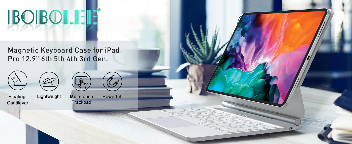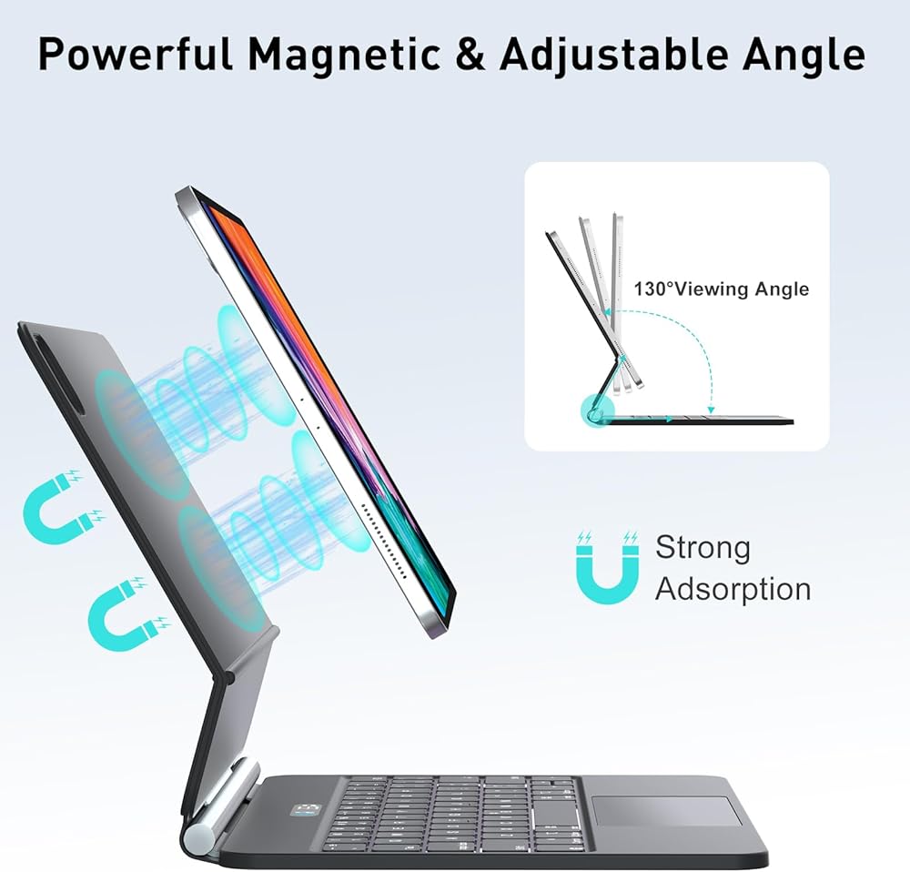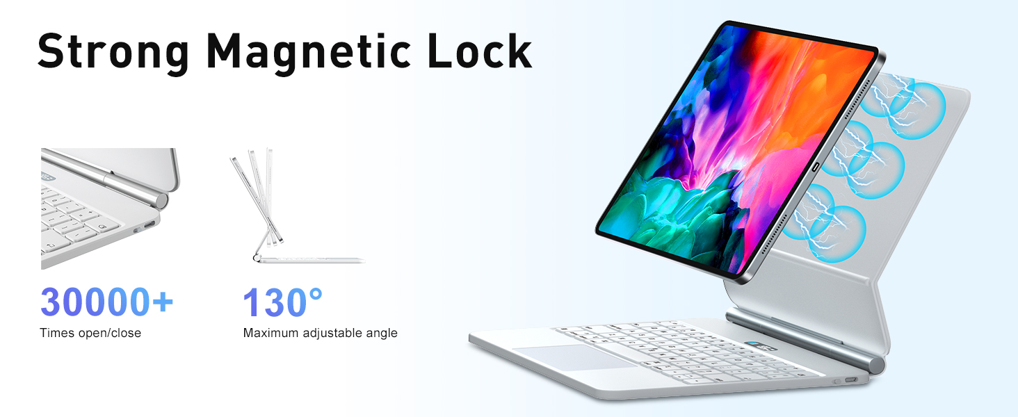 تصميم عائم مغناطيسي - مع تصميم الحامل العائم، يتم تثبيت iPad مغناطيسيًا بشكل آمن على الغطاء الخلفي لحافظة لوحة المفاتيح iPad Pro 12.9 بوصة ويمكن تعديله بسهولة إلى زاوية رؤية مريحة [زاوية 135 درجة قابلة للتعديل]، والتي تتحول إلى زاوية رؤية عالية كمبيوتر محمول عالي الأداء وسهل الاستخدام في ثانية واحدة. إنها مثالية للسفر والعمل والمدرسة.