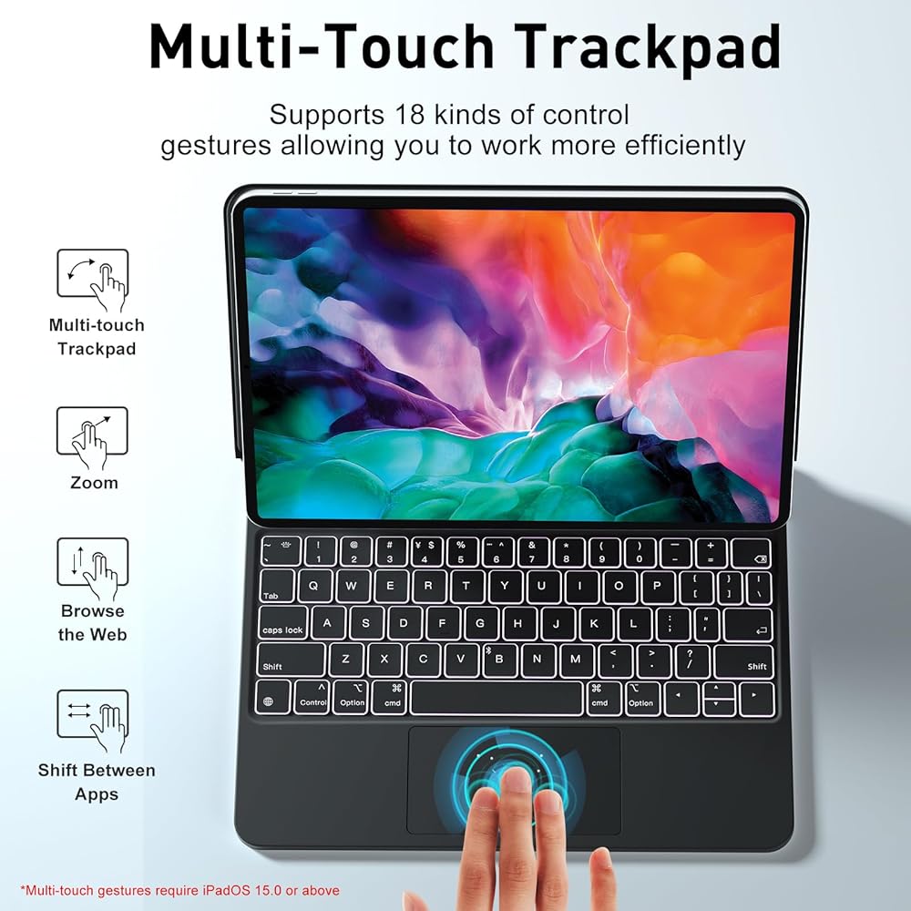 لوحة تتبع متعددة اللمس وحامل أقلام - حافظة لوحة المفاتيح السحرية لجهاز iPad Pro مقاس 12.9 بوصة مدمجة في لوحة تتبع متعددة اللمس تتعرف بدقة على 18 إيماءة تحكم للتحكم السريع والسهل في جهاز iPad الخاص بك. مفاتيح منظمة على شكل مقص مع زمن وصول 0 وبدون ضوضاء تعمل على تحسين إنتاجيتك بشكل كبير على آي باد. ملحوظة: يرجى ترقية جهاز iPad الخاص بك إلى iOS 15.0 وما فوق للاستفادة الكاملة من ميزة لوحة اللمس؛ يمكن ضبط حساسية لوحة التتبع على جهاز iPad الخاص بك. تأتي حافظة لوحة المفاتيح السحرية مع حامل قلم رصاص لتجنب فقدان أقلام الرصاص (لا يتضمن القلم).