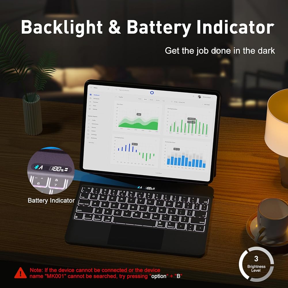 مؤشر الإضاءة الخلفية والبطارية - حافظة لوحة المفاتيح لجهاز iPad Pro مقاس 12.9 بوصة مع 3 أوضاع سطوع وإضاءة خلفية أحادية اللون تجعل الكتابة في الظلام بسهولة. تم تصميم مؤشر البطارية على يسار زر التبديل بلوحة المفاتيح، والذي يمكنه عرض استخدام طاقة لوحة المفاتيح بوضوح. عندما تكون طاقة لوحة المفاتيح منخفضة، يمكنك شحنها في الوقت المناسب لتجنب تأخير تقدم العمل. ملحوظة: يصعب فصل كابل USB-C وهو تصميم محكم لمنع ضعف الاتصال بسبب الارتخاء.