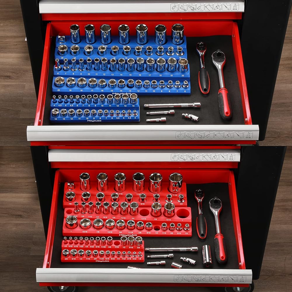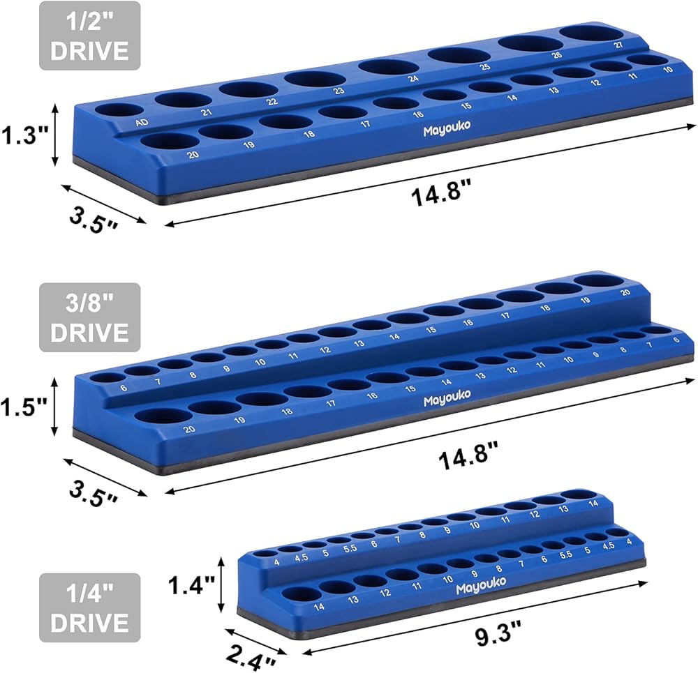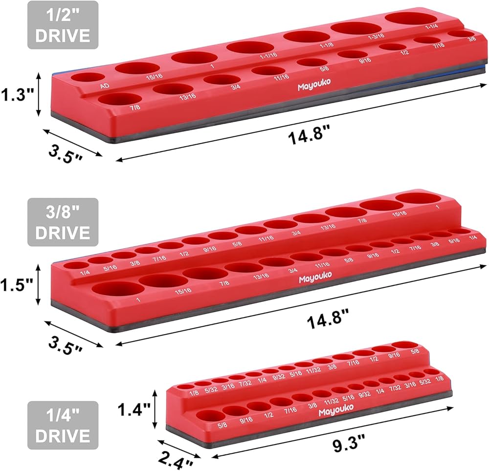 This set includes 3pcs sae red magnetic socket organizer, one for 1/4" drive, one for 3/8"drive, one for 1/2"drive, which can store up 68 of deep and shallow sockets totally.*Sockets are not included.*