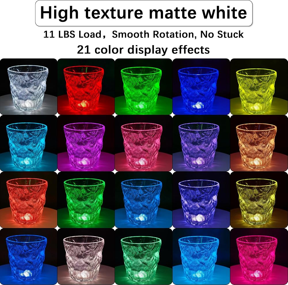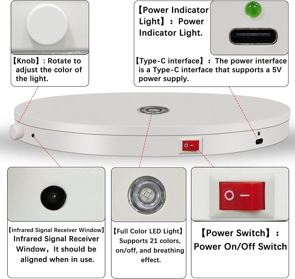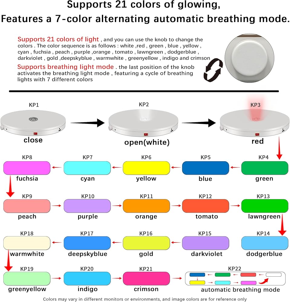【21 لونًا مع وضع ضوء التنفس】: حامل العرض الدوار مع ضوء LED يدعم 21 لونًا من الضوء، ويمكنك استخدام المقبض لتغيير الألوان. تسلسل الألوان هو كما يلي: "الأبيض والأحمر والأخضر والأزرق والأصفر والسماوي والفوشيا والخوخ والأرجواني والبرتقالي والطماطم والأخضر العشبي والأزرق المراوغ والبنفسجي الداكن والذهبي والأزرق الداكن والأبيض الدافئ والأخضر والأصفر والنيلي والقرمزي"، يدعم وضع ضوء التنفس، الموضع الأخير للمقبض ينشط وضع ضوء التنفس، ويضم دورة من أضواء التنفس مع 7 ألوان مختلفة.