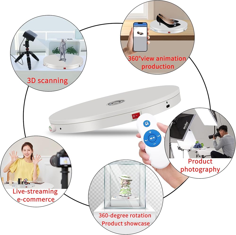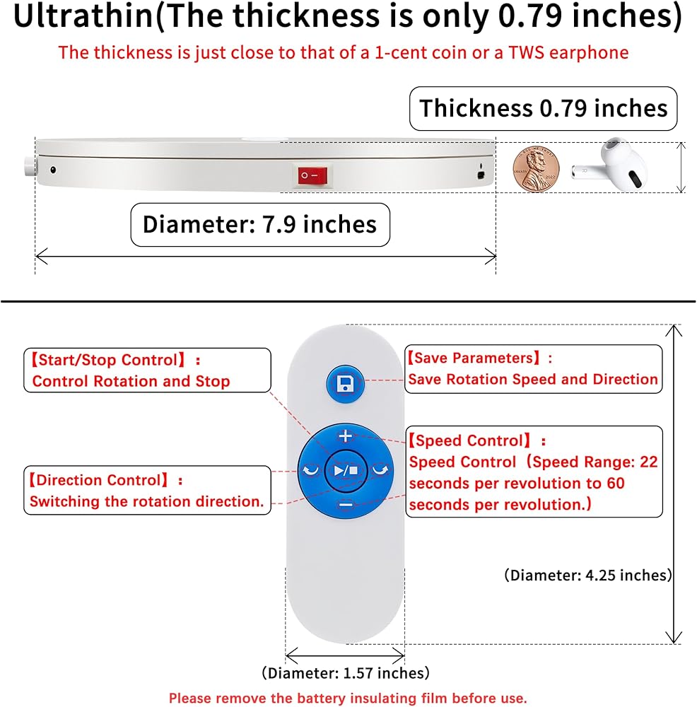 【تصميم هيكلي احترافي فائق النحافة】: يبلغ سمك حامل العرض الدوار 0.79 بوصة فقط وقطره 7.9 بوصة، مع تصميم رائع للغاية. بالإضافة إلى ذلك، فإنها تستخدم محامل انزلاقية مسطحة داخليًا، مما يضمن الدوران السلس مع الحد الأدنى من التآكل ومتانة طويلة الأمد. تحمل 11 رطلاً، نطاق السرعة 22-60 ثانية لكل دائرة، السرعة القصوى 22 ثانية لكل دائرة والحد الأدنى للسرعة 60 ثانية لكل دائرة. سمكها قريب جدًا من سمك عملة معدنية بقيمة سنت واحد أو سماعة أذن TWS.