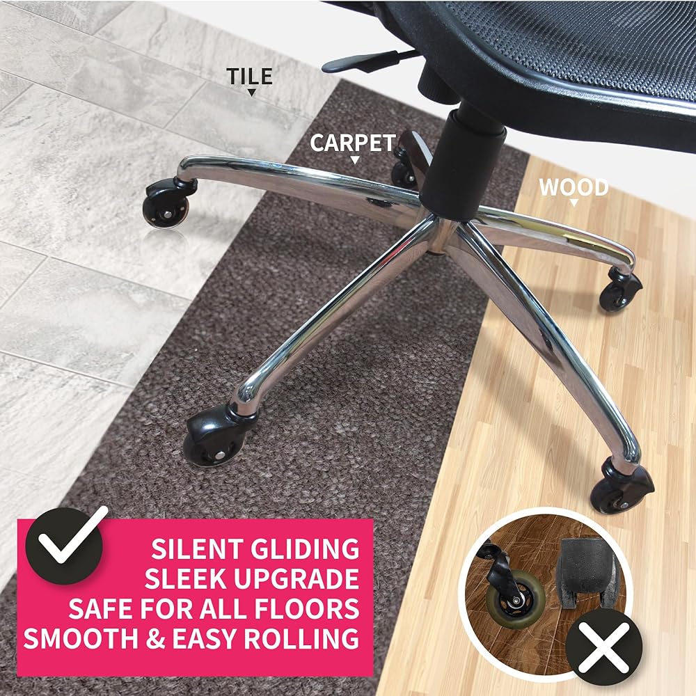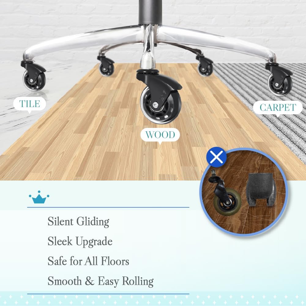 SMOOTH AND QUIET ROLLERBLADE STYLE CHAIR WHEELS: Nylon caster wheels on most office chairs are not designed for hard floors and can pose a health safety risk due to sudden slipping. Our advice always uses a soft, non-slip polyurethane wheel on hard floors