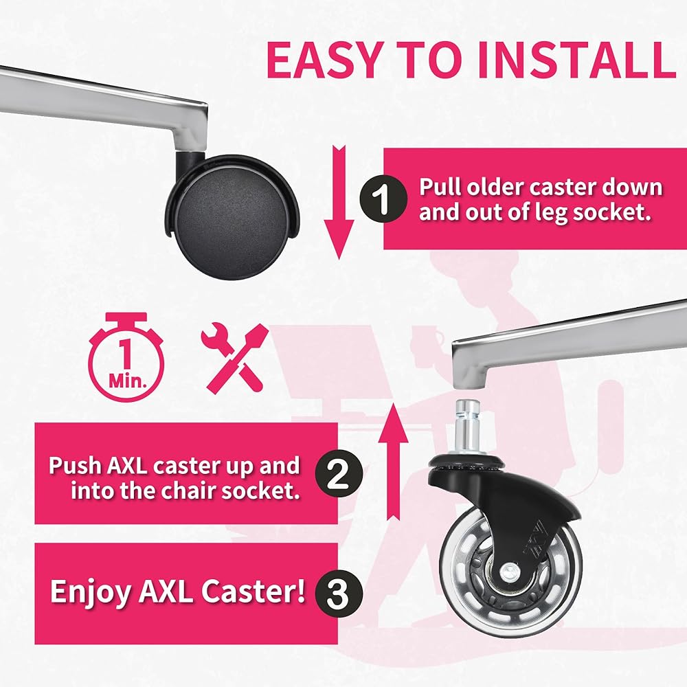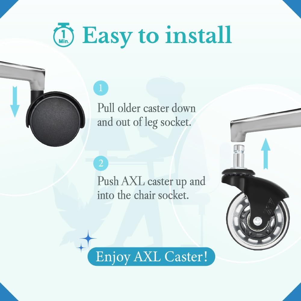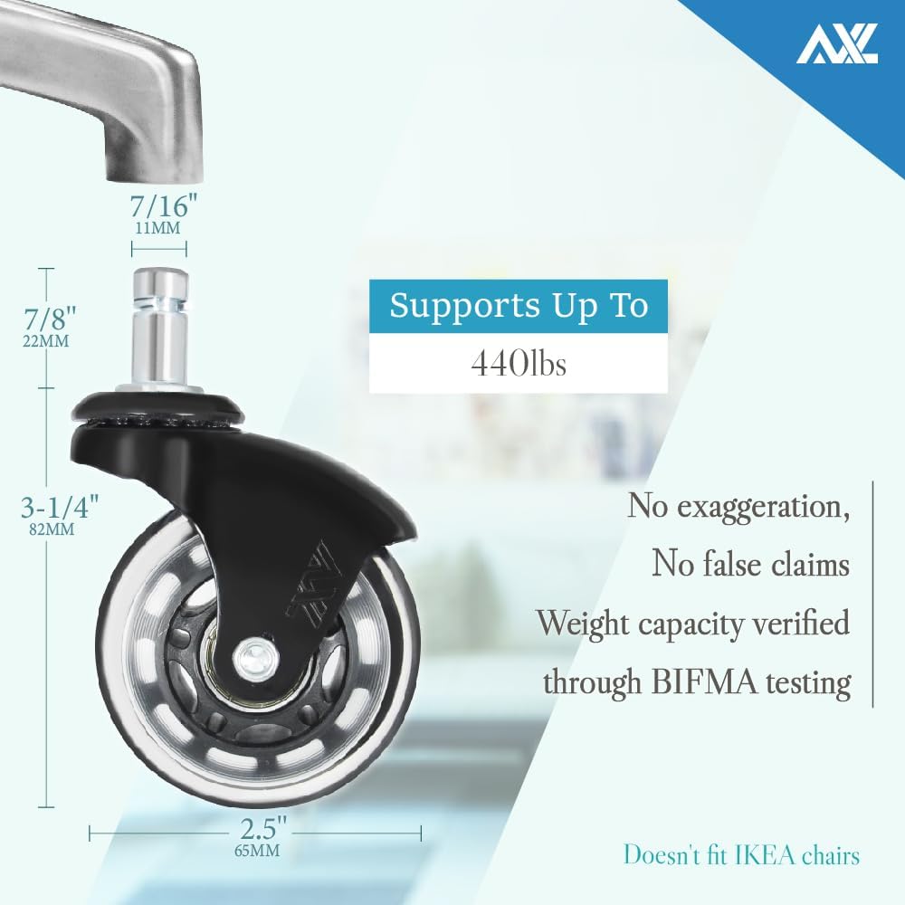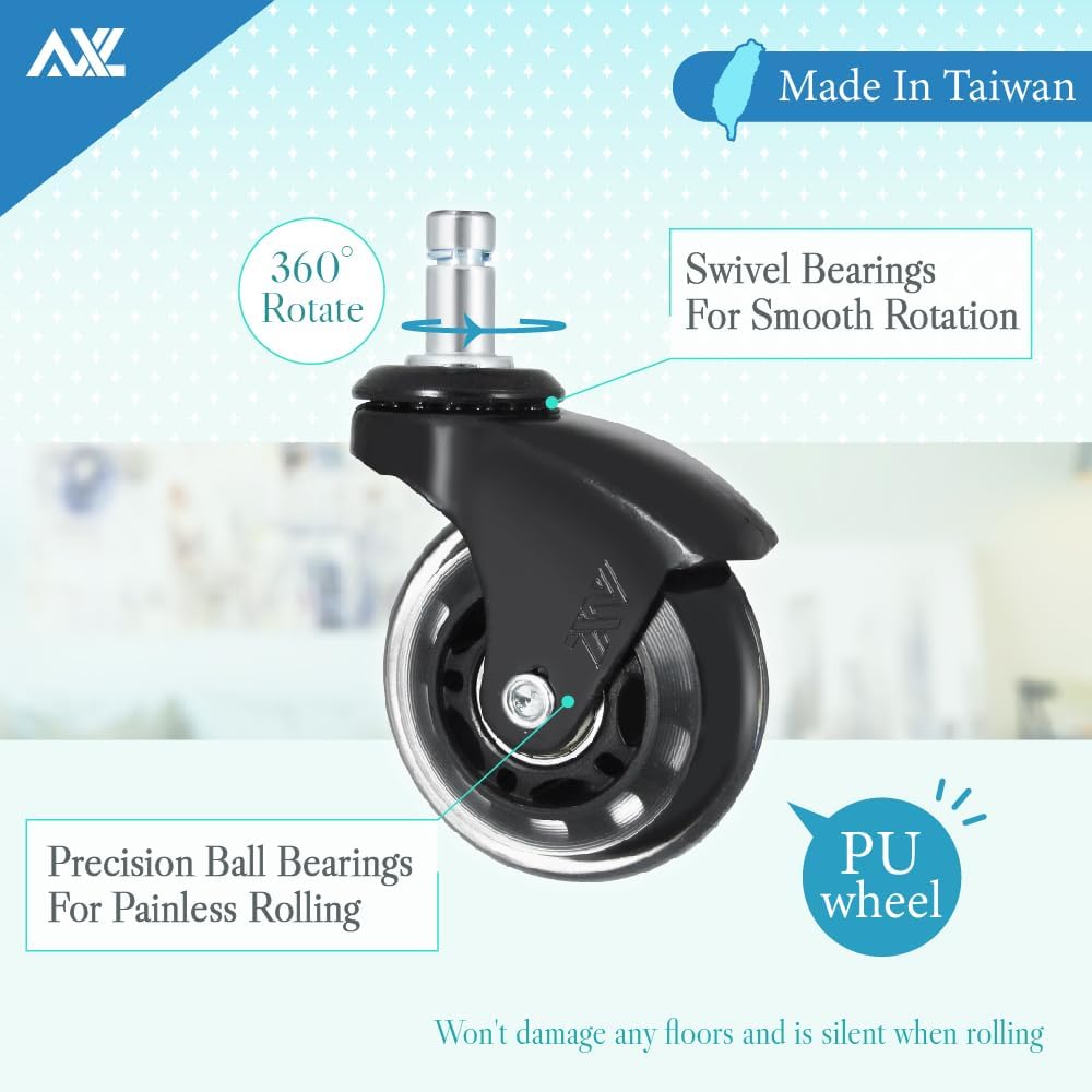 • ✔ WARRANTY – At AXL, we have great faith in our rollerblade style office chair wheels. Our caster wheels come with a lifetime guarantee. For any issue with them, please feel free to contact us with your free office chair casters replacement.
