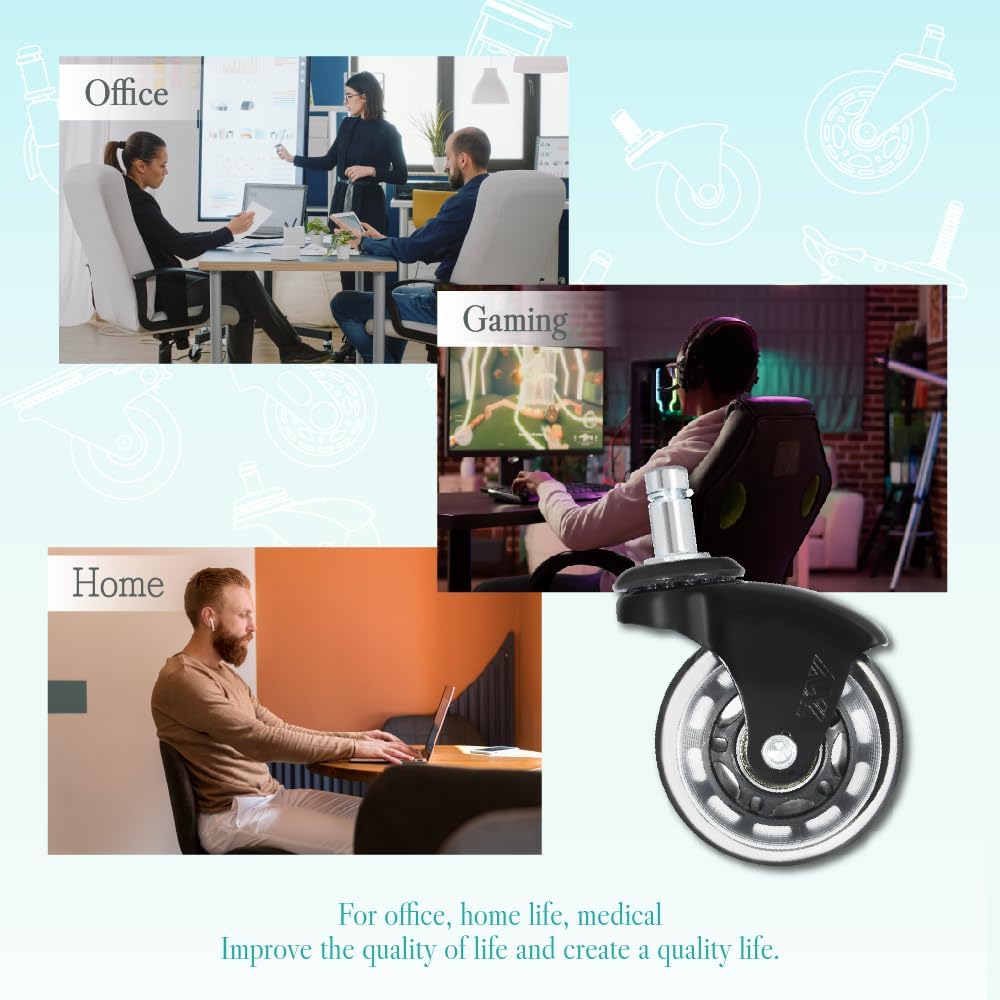 • ✔ STYLE OF CHAIR CASTER WHEELS – Our office chair wheels are designed with the universal standard size stem, so you can transform any desk chairs or stools that roll into modern, striking furniture. These wheels have been regarded as the absolute best upgrades to Herman Miller Aeron, Hon, and most of other brands on gaming chairs or desk chairs. (Besides using as desk chair wheel, some other products with 11x22mm friction ring stem are also replaceable with our office chair wheels.)