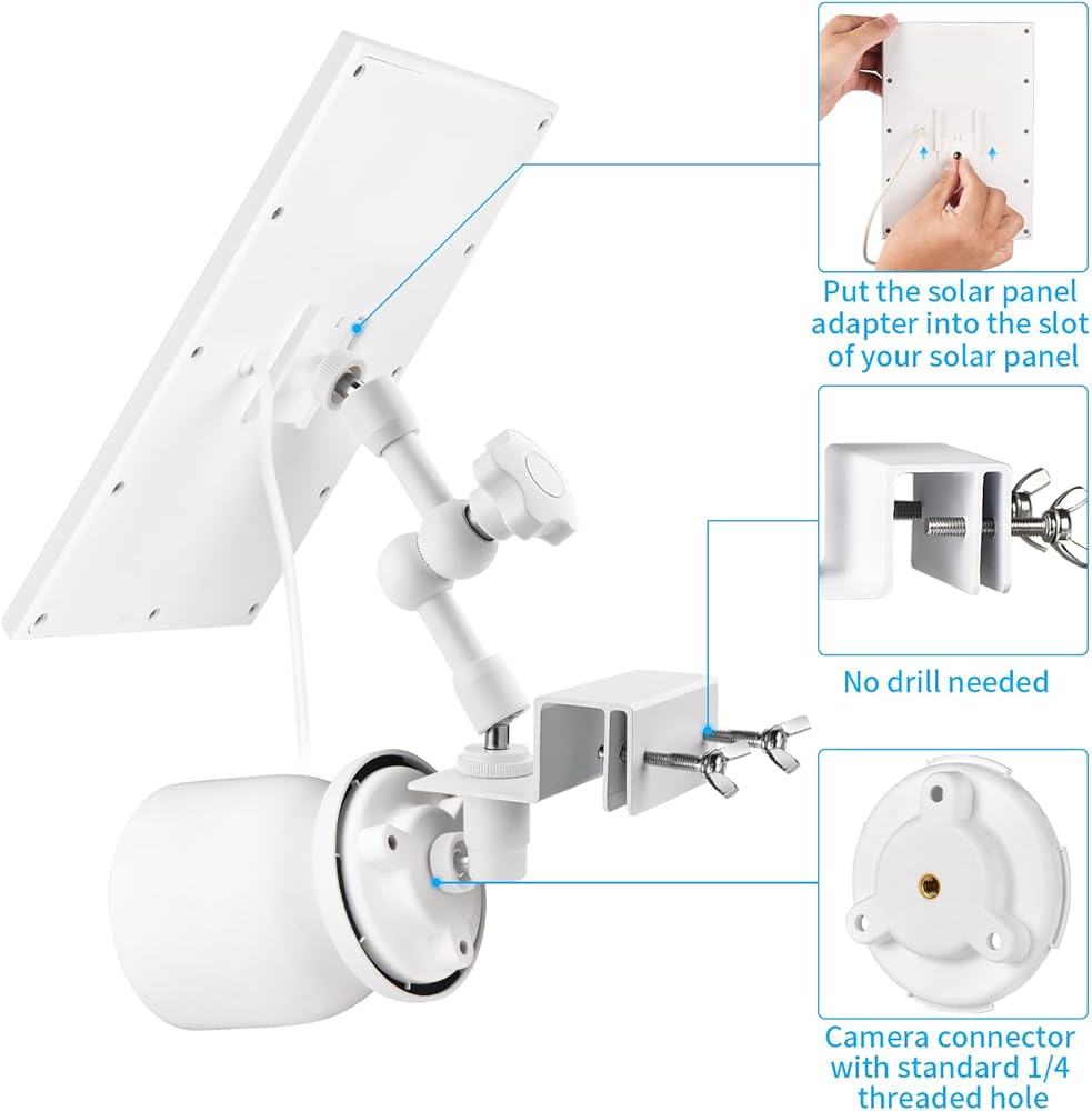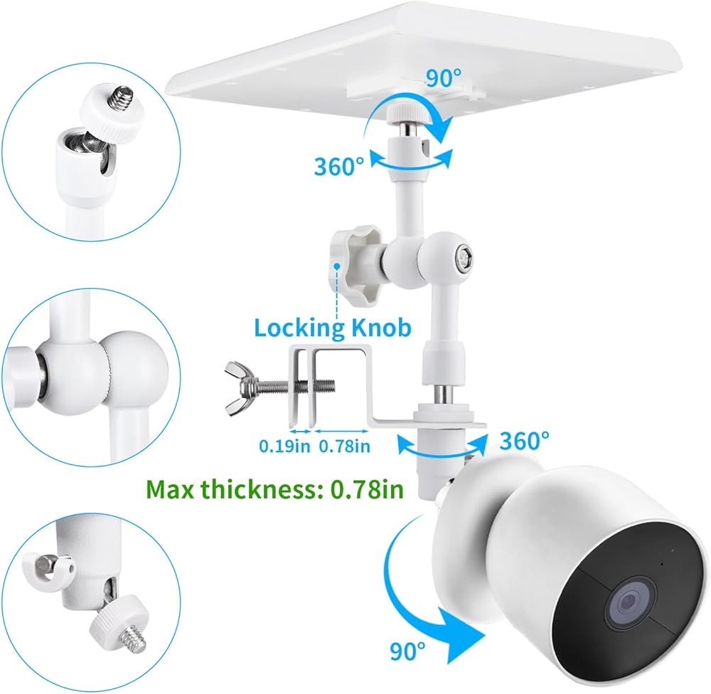 دعامة تثبيت 2 في 1: تسمح لك بتركيب الكاميرا واللوحة الشمسية معًا بشكل آمن، ويوفر الدوران 360 درجة مرونة أكبر في ضبط زاوية اللوحة الشمسية للحصول على أقصى قدر من ضوء الشمس.
