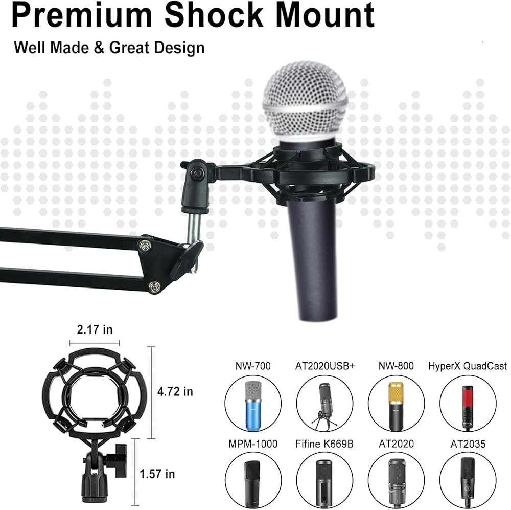 🎶【حامل للصدمات وحامل ميكروفون بهيكل عالي التحمل】يُرجى ملاحظة أن حامل الصدمات غير مناسب لـ Blue Yeti. إنه مصنوع من مواد عالية الجودة ويمكنه حماية الميكروفون من جميع النواحي بتصميم حبل مطاطي عالي مما يجعل الميكروفون أكثر ملاءمة للتثبيت ويمنعه من السقوط. يبلغ قطر فتحة حامل الصدمات 52 مم، وهو أكبر قليلاً من الآخرين. يمنع الزنبرك القوي الإضافي لذراع الذراع الميكروفون من السقوط العرضي وتوليد الضوضاء والاهتزاز.