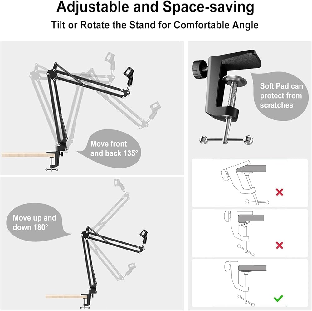 🎙【قاعدة مشبك طاولة مطورة】يأتي ذراع ذراع التعليق مع مشبك مكتب واحد، ويمكن تثبيته بسهولة على أي سطح مكتب يصل سمكه إلى 1.89 بوصة/4.8 سم. يمكن للإسفنجة الموجودة على قاعدة مكتب حامل الميكروفون حماية مكتبك دون أي خدوش عند تدوير الجانب. برغي، يمكن لحامل الميكروفون حمل الميكروفون الثقيل لفترة طويلة.