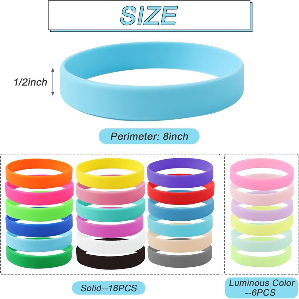 ما تحصل عليه - ستحصل على 24 قطعة من أساور المعصم المطاطية المصنوعة من السيليكون الملون، بما في ذلك 18 لونًا تقليديًا مختلفًا و6 ألوان مضيئة. كمية كافية يمكن أن تلبي بشكل جيد استخدامك اليومي وهدايا الحفلات المختلفة.