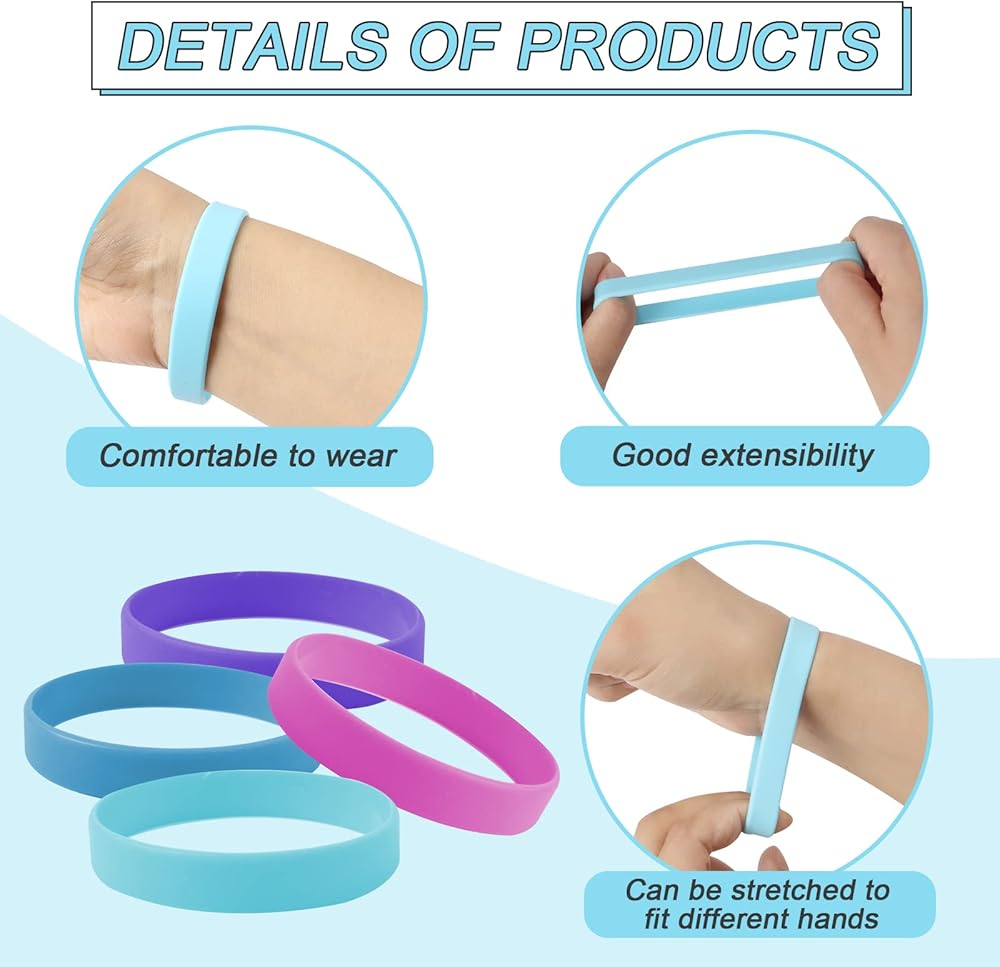 المقاس - كل سوار معصم من السيليكون المطاطي له نفس الحجم، عرض 1/2 بوصة وطول 8 بوصة. يمكن تمديد أساور السيليكون الملونة بشكل جيد لتناسب الأيدي المختلفة، ومناسبة لمعظم المراهقين والبالغين.