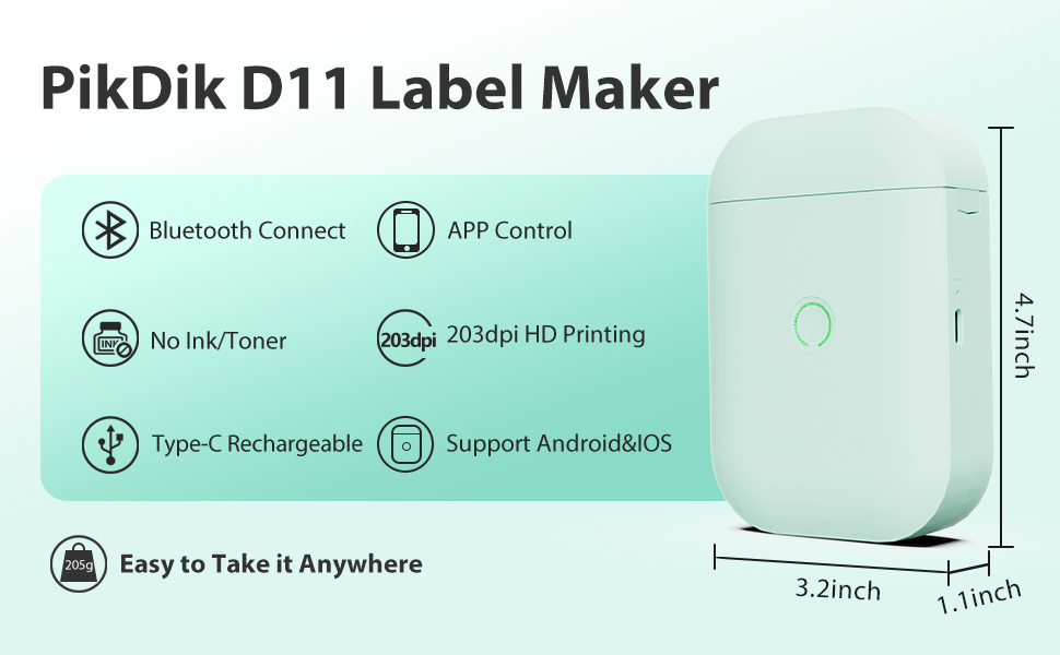 لاسلكي ومحمول: تتيح لك ميزة اتصال Bluetooth 5.2 في صانع الملصقات PikDik D11 توصيله بهاتفك الذكي أو جهازك اللوحي عبر البلوتوث، مما يجعل طباعة الملصقات سهلة دون عناء. قل وداعًا لآلات وضع العلامات السلكية التقليدية، واستمتع بالحرية التي تأتي مع صانع الملصقات اللاسلكي الخاص بنا. PikDik D11 سهل الحمل وصغير الحجم بشكل لا يصدق، مما يجعل من السهل اصطحاب العناصر معك في أي مكان وفي أي وقت باستخدام آلة وضع الملصقات سهلة الاستخدام.