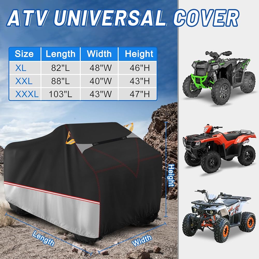 • [ملاءمة عالمية] يرجى قياس حجم ATV الخاص بك ثم الرجوع إلى جدول المقاسات الخاص بنا لاختيار أفضل مقاس. يبلغ الغطاء 88 بوصة طولًا × 40 بوصة عرضًا × 43 بوصة ارتفاعًا، وهو مناسب لمعظم دراجات الشاطئ من طراز Kawasaki Yamaha وSuzuki Polaris Raptor.