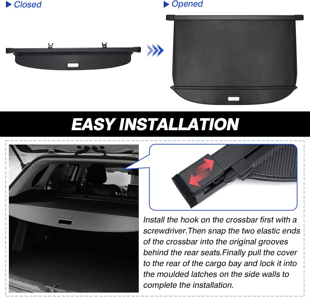 سهلة التركيب - قم بتثبيت الخطافات على العارضة باستخدام مفك البراغي؛ قم بتثبيت الطرفين المرنين للشريط في الفتحات الأصلية الموجودة خلف المقاعد الخلفية؛ اسحب الغطاء إلى الجزء الخلفي من حجرة الشحن وقم بتثبيته في المزالج المقولبة الموجودة على الجدار الجانبي لإنهاء التثبيت.