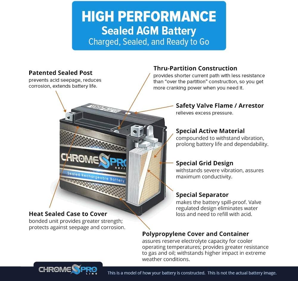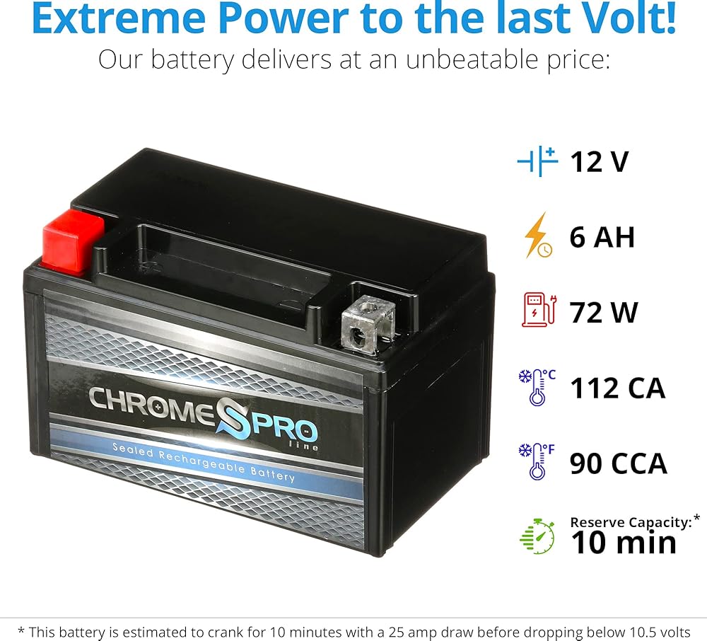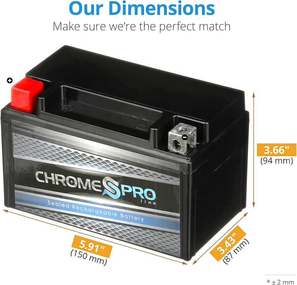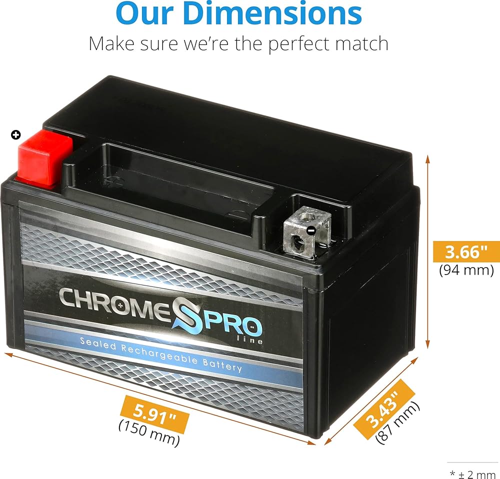 Chrome Pro introduces the YTX7A-BS iGel battery series, designed for customers who seek rigorous standards and quality. Featuring a built-in battery display to accurately read voltage and injected with Gel electrolytes, these batteries redefine excellence. The Gel electrolytes give the battery a low electrode wear, and thus a longer life. The display reads the voltage of the battery and alternator while an alarm warns you if there is low capacity/voltage or abnormalities. Elements like the tough bridge welding, which helps to absorb vibrations, make this battery the premier choice of Power Sport adventurers. Chrome Pro iGel series boasts a longer warranty, guaranteed refund, and extended life expectancy than our other brands: Zipp, Pirate, and Chrome. All YTX7A-BS iGel Chrome Pro series batteries are manufactured with high caliber materials and rigorously tested to ensure safety, OEM compatibility, effectiveness and optimal performance. YTX7A-BS iGel Chrome Pro series has a Digital display with a built-in intelligent chipNo spills, no leaks, and no water to checkExtreme vibration resistance to ensure maximum conductivity. High Cranking Amps & Low Self-Discharge Rate. Fully charged, ready for immediate use. Fits in a variety of applications, ranging from motorcycles, ATVs, UTVs, Jet Skis, snow-mobiles, scooters and more.Also Replaces: 4423, CTX7A-BA, GTX7A, GTX7A-BS, M32X7A, MF12V7-2A, MFA127AH, MTX7A-BS, LTX7A-BS, PTX7A-BS, UTX7A, YTX7A-BS.