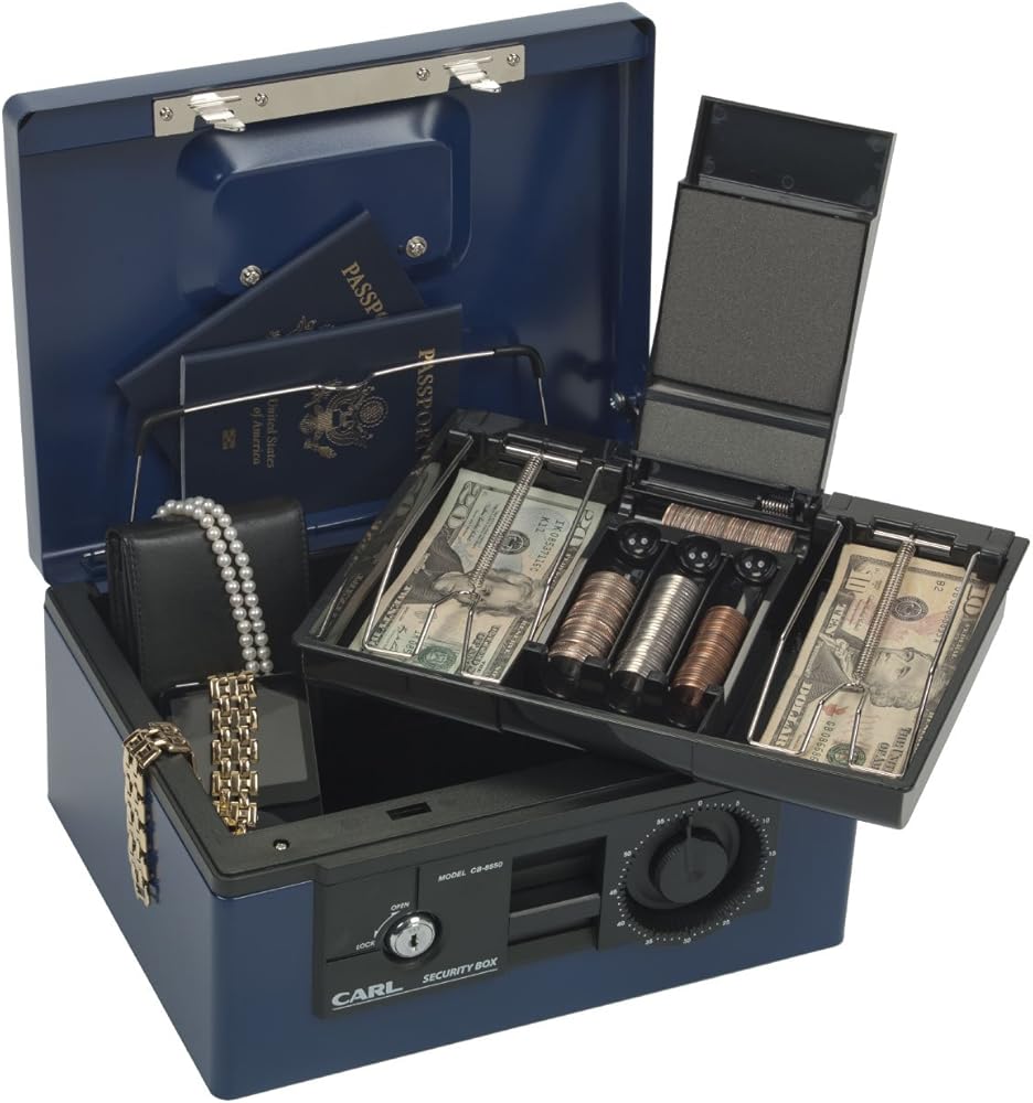 CARL Cash Box, Large, heavy-duty construction with smooth modern styling and supplied complete with a removable inner cash/ coin tray and dual lock (key and combination).