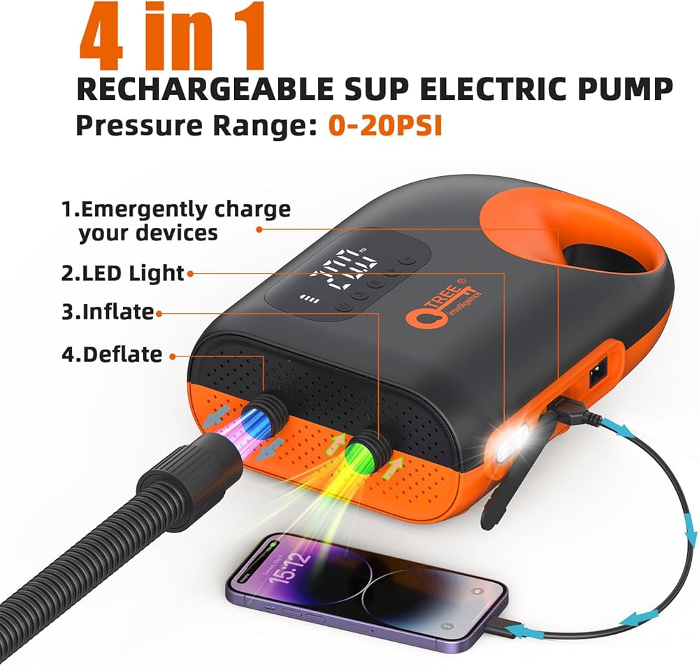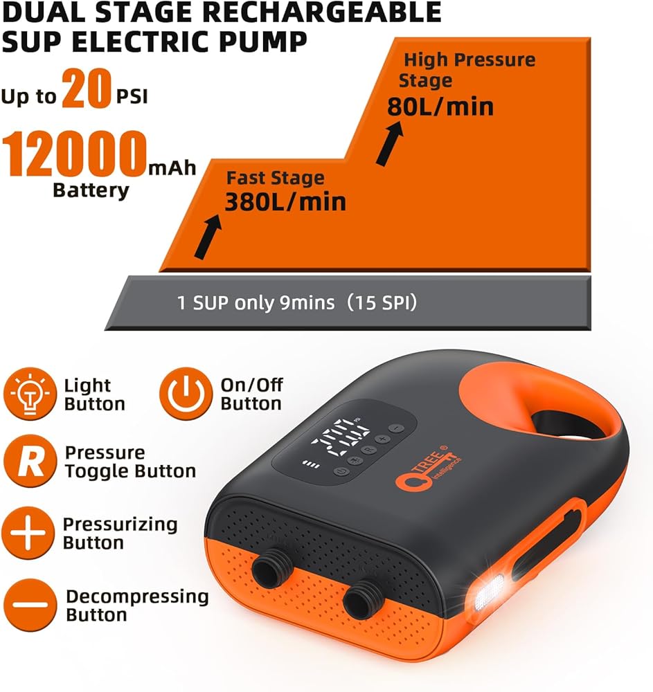 مضخة هواء SUP قابلة لإعادة الشحن بقدرة 12000 مللي أمبير في الساعة، تضخم ذكي مزدوج المرحلة عالي الضغط 20 رطل لكل بوصة مربعة مع ميزة الإيقاف التلقائي وإضاءة LED، وظيفة الانكماش لألواح التجديف والقوارب والخيمة