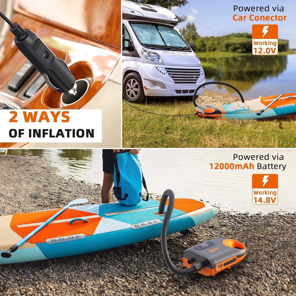 بطارية قابلة لإعادة الشحن: مع بطارية قابلة لإعادة الشحن بقوة 12000 مللي أمبير في الساعة، توفر مضخة الهواء هذه طاقة طويلة الأمد ويمكنها نفخ ما يصل إلى 4 بطاريات SUP بشحنة واحدة، مما يجعلها مثالية للرياضات المائية. قم بتوصيل المضخة بشاحن السيارة لإعادة الشحن السريع عند نفاد طاقة البطارية. ويمكن أيضًا استخدام مضخة الهواء SUP كبنك طاقة للطوارئ لأجهزتك الإلكترونية.