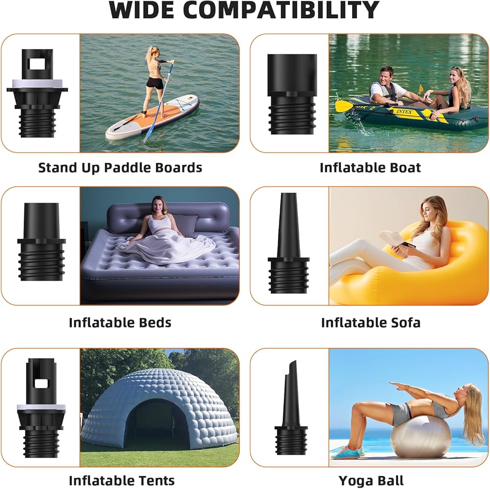 ليس فقط من أجل لوح التجديف: يمكن استخدام مضخة لوح التجديف هذه لتضخيم ليس فقط ألواح التجديف ولكن أيضًا قوارب الكاياك والقوارب وغيرها من المركبات المائية القابلة للنفخ. يأتي مع 6 محولات صمامات عالمية تناسب معظم الأجهزة القابلة للنفخ. اشترِ بثقة واستمتع بمغامراتك المائية بسهولة!