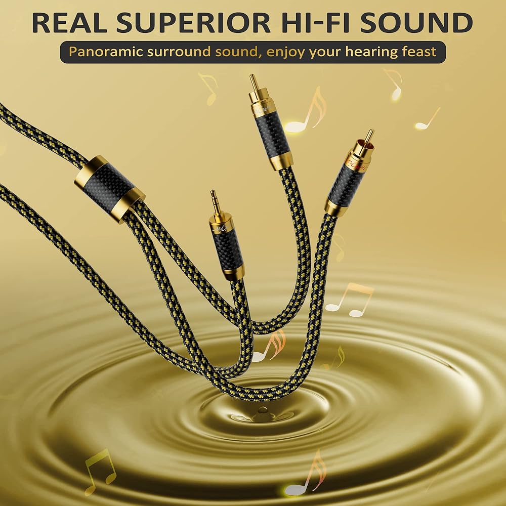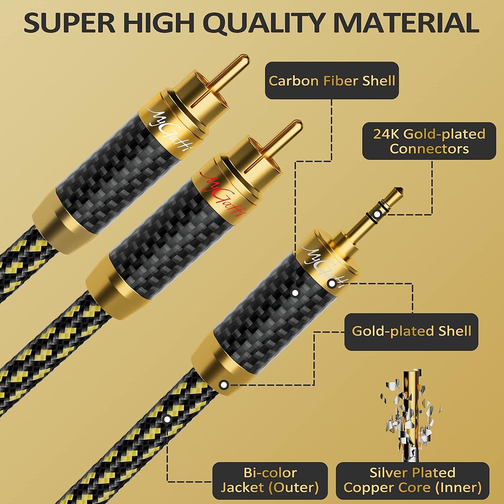 High Quality Connectors : Mygatti 3.5mm to dual RCA cable adopts 24K gold-plated connector design, which can resist corrosion and reduce discoloration, providing you with stable and tight connection. And the connector has a carbon fiber shell in the middle, providing excellent texture. With a high-end splitter made of pure copper and carbon fiber are used to better protect the diverter structure to achieve extraordinary sound quality effects.