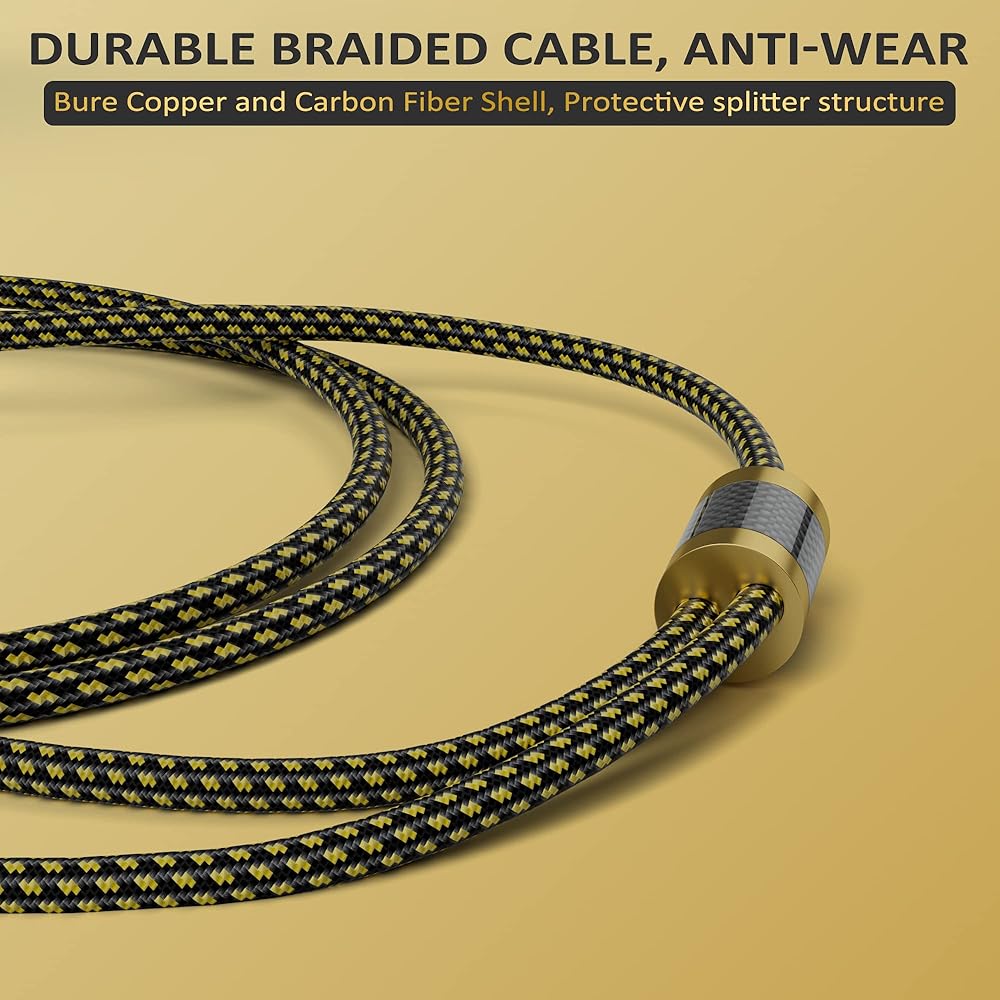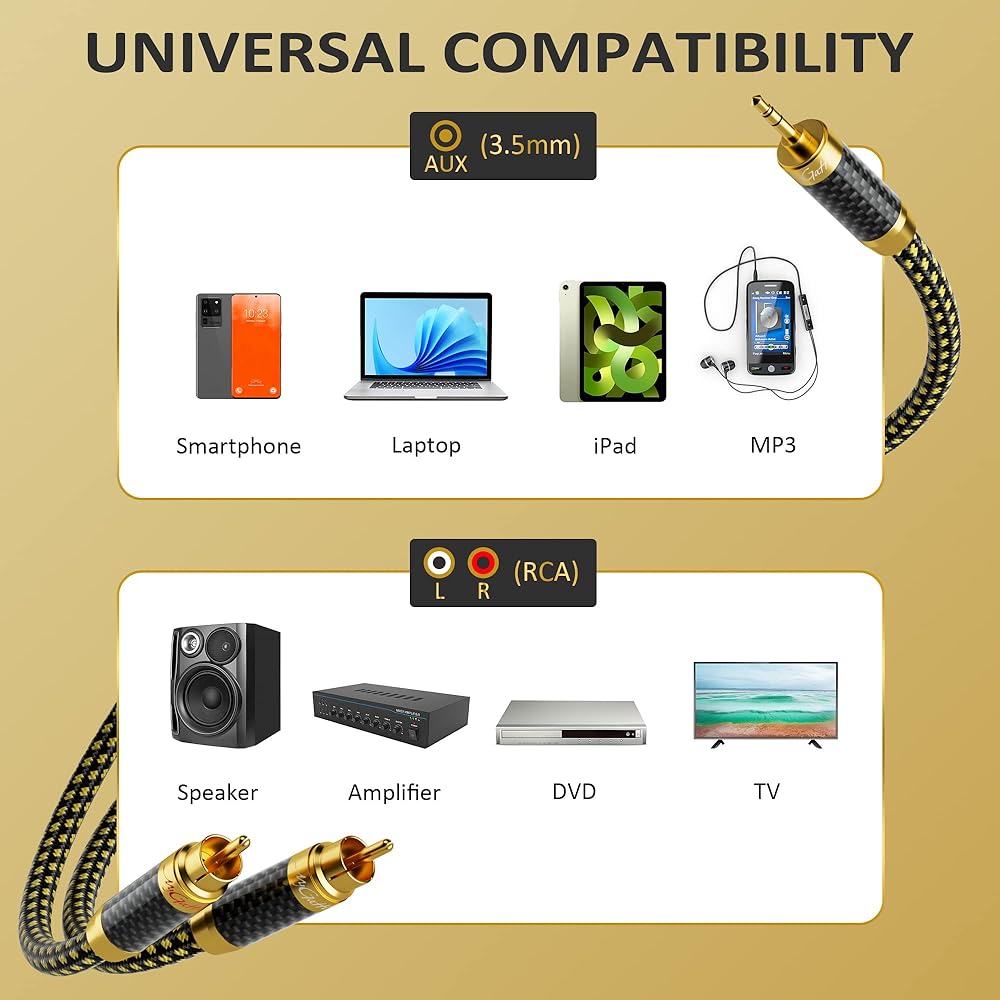 Bi-color Nylon Braided Jacket : The 1/8 to 2RCA audio cord is built to last forever. Use bright golden yellow and black nylon braided as outer jacket. Passes 15,000+ bend tests and can withstand any twist, tug, and tangle.