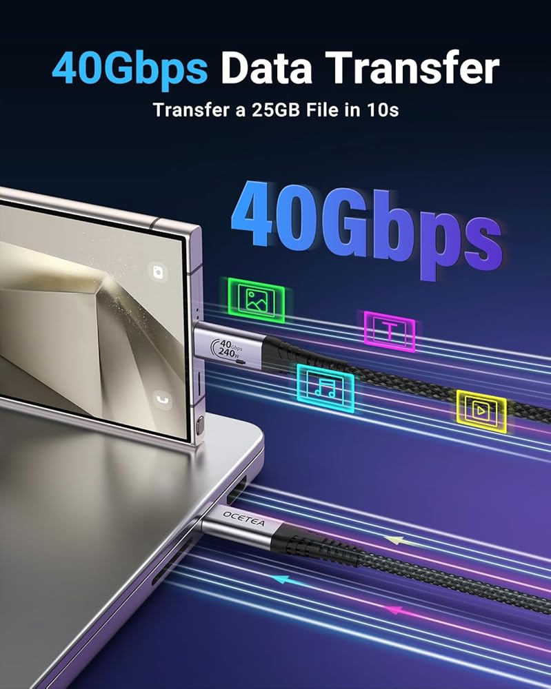 【نقل بيانات 40 جيجابايت في الثانية وشحن سريع 240 واط】يستخدم كابل بيانات USB4 الخاص بنا كابل 16 نواة، وأسلاك نحاسية 8 نواة 98 قطعة مسؤولة عن نقل البيانات بسرعة 40 جيجابت في الثانية، وتصل أقصى سرعة نقل في الثانية إلى 2.5 جيجا؛ 297 قطعة من الأسلاك النحاسية ذات 8 النواة مسؤولة عن الشحن السريع بقدرة 240 وات، وتدعم بروتوكول الشحن PD3.1/PD3.0/PD2.0/ QC4.0/QC3.0/QC2.0 FCP PPS.
